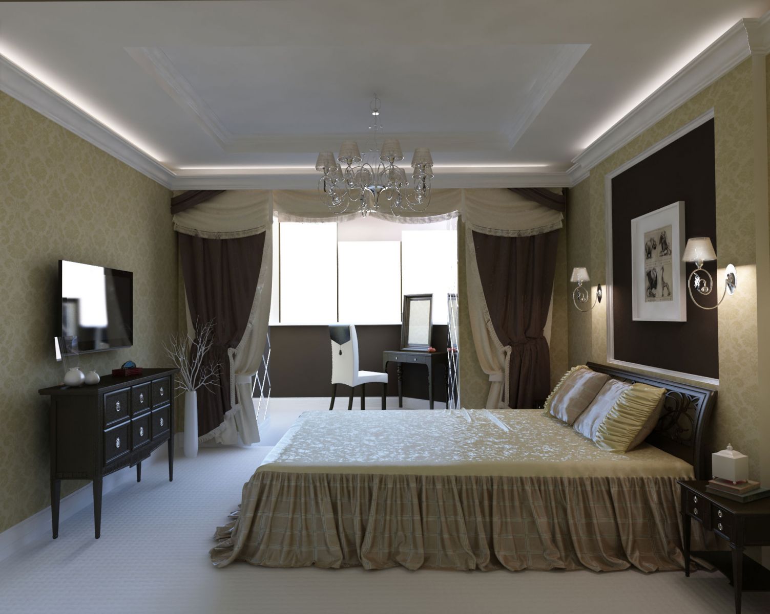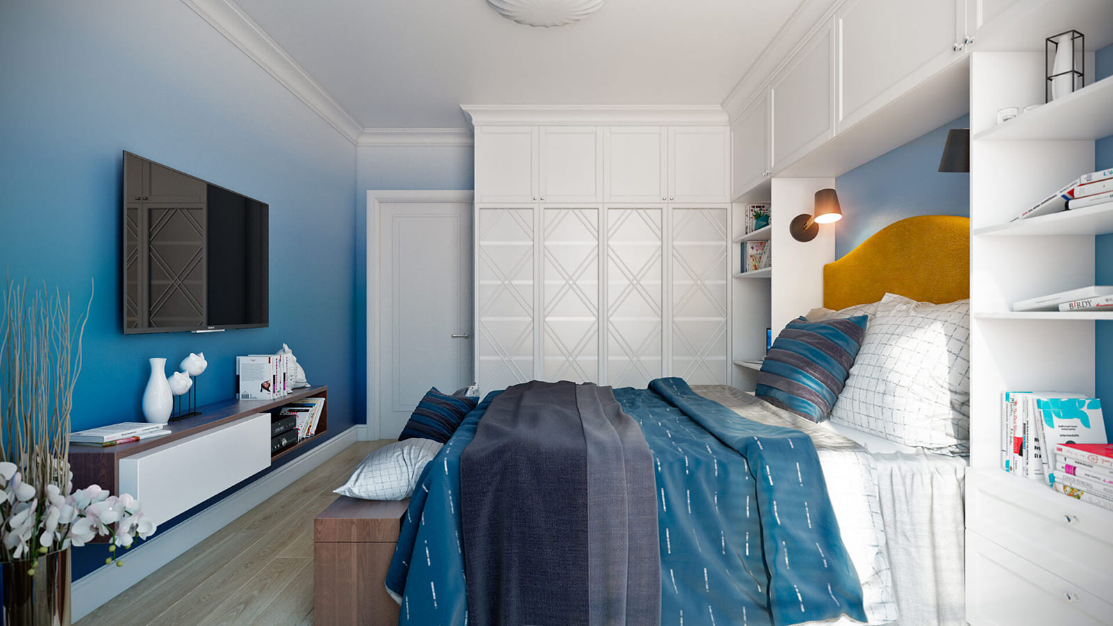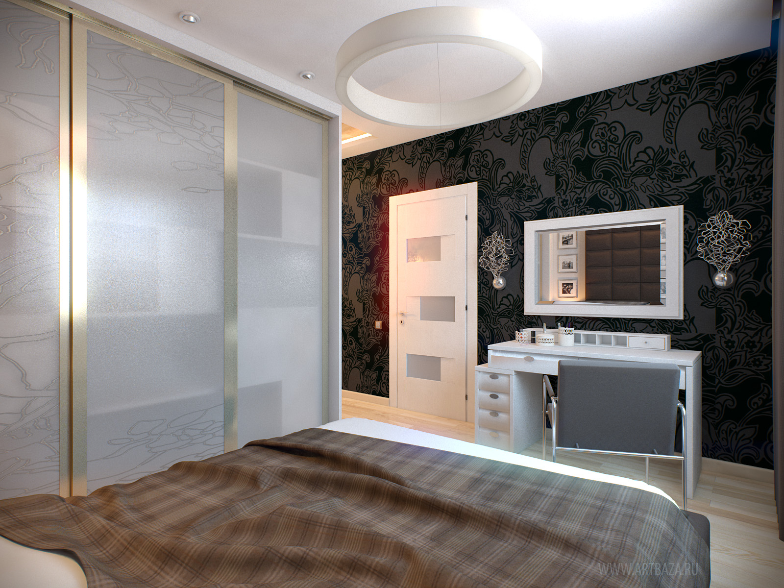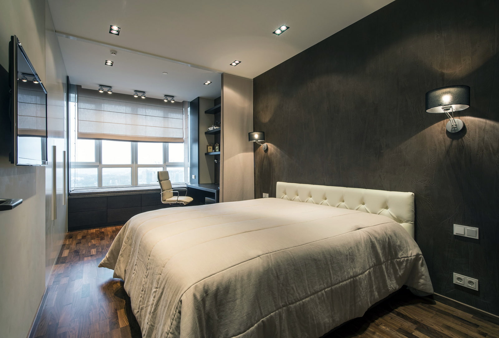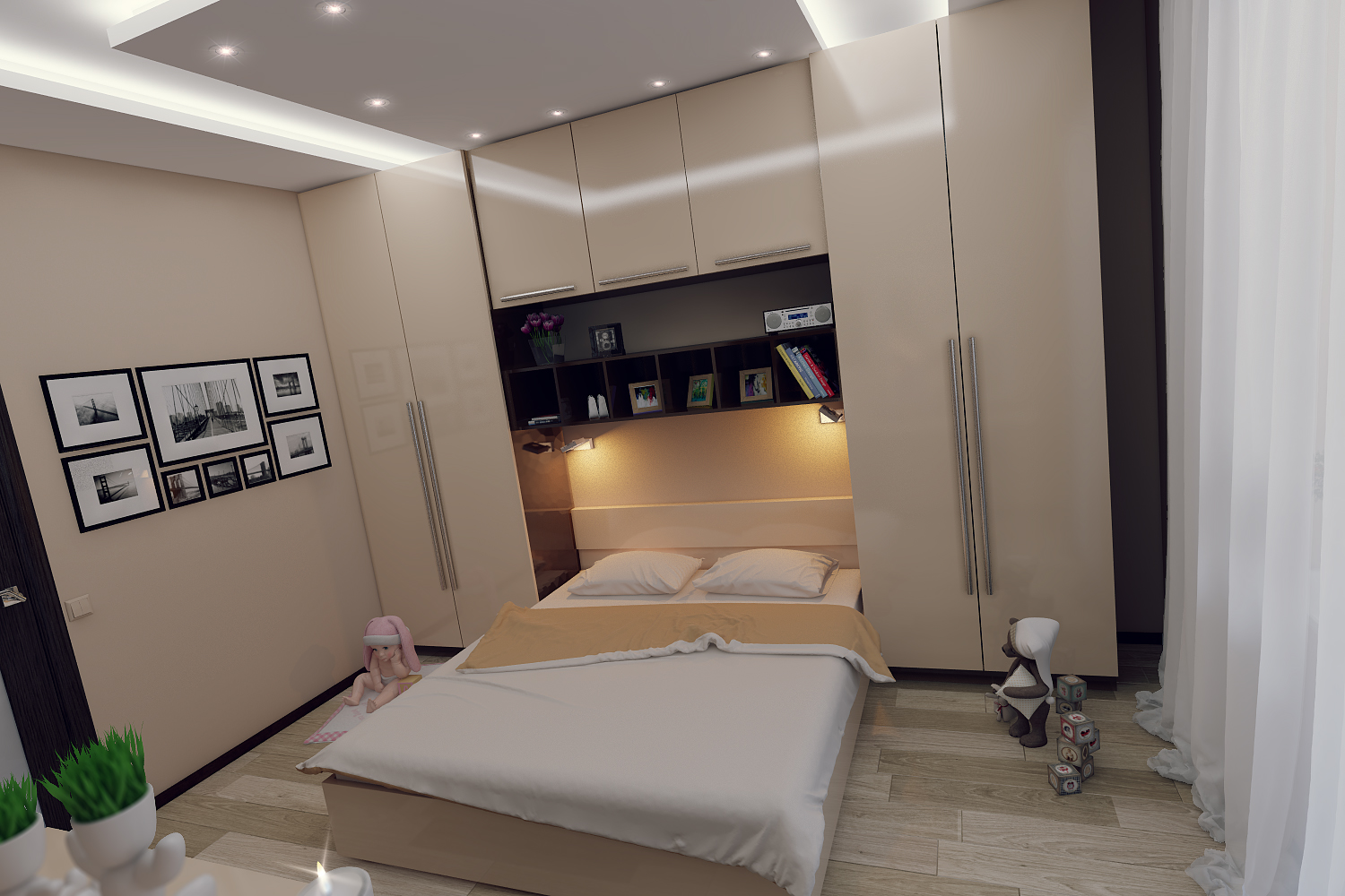 The bed is usually placed head to the wall. But if it is double, then on both sides there should be approx. 0.7 m. Placing the bed close to the window or opposite the entrance is not advisable. Wardrobe advised to put tightly to the wall (not only to the one in which there is a window). The best option is against the light or perpendicular to it.
