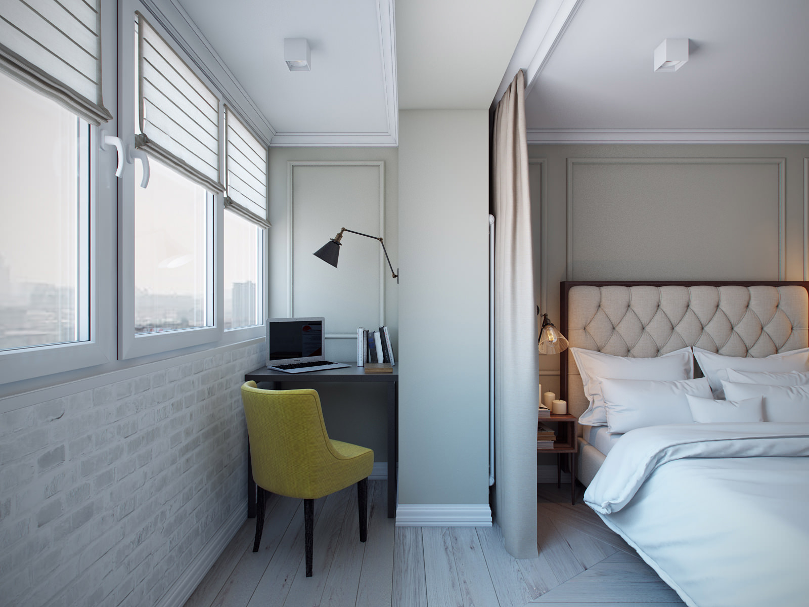 Usually on a balcony or loggia in such cases, auxiliary working area is carried out. However, there it will be possible to equip the area for undisturbed leisure. It is worth paying attention to the fact that It is recommended to use the same design concepts when planning such a solution, maximizing the space visually.