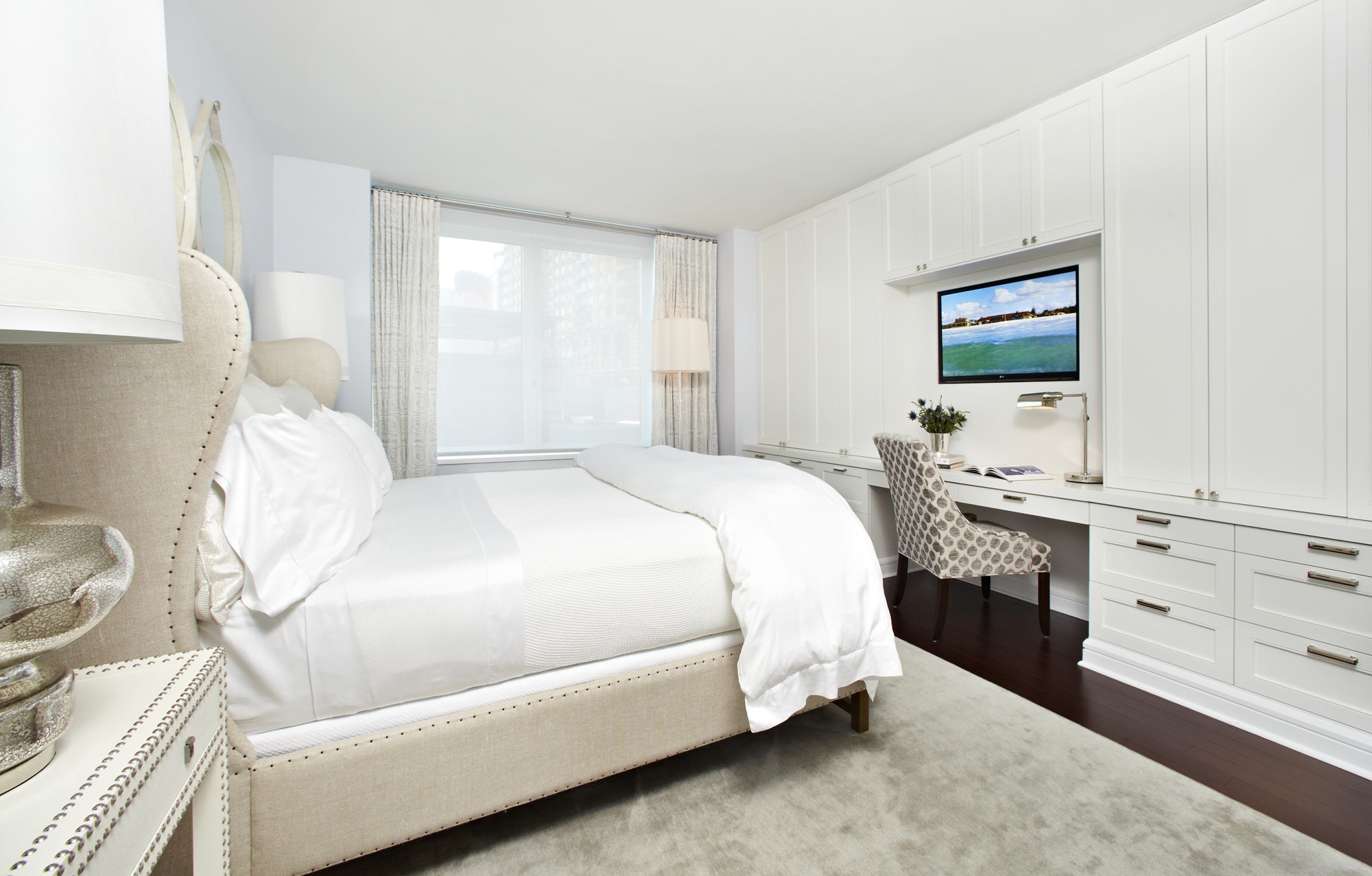 The brighter bedroom looks all the more prettier. The photo shows how the white wall and the white sofa are combined. A pleasant combination also forms a light yellow furniture. Grace adds an internal niche lighting.