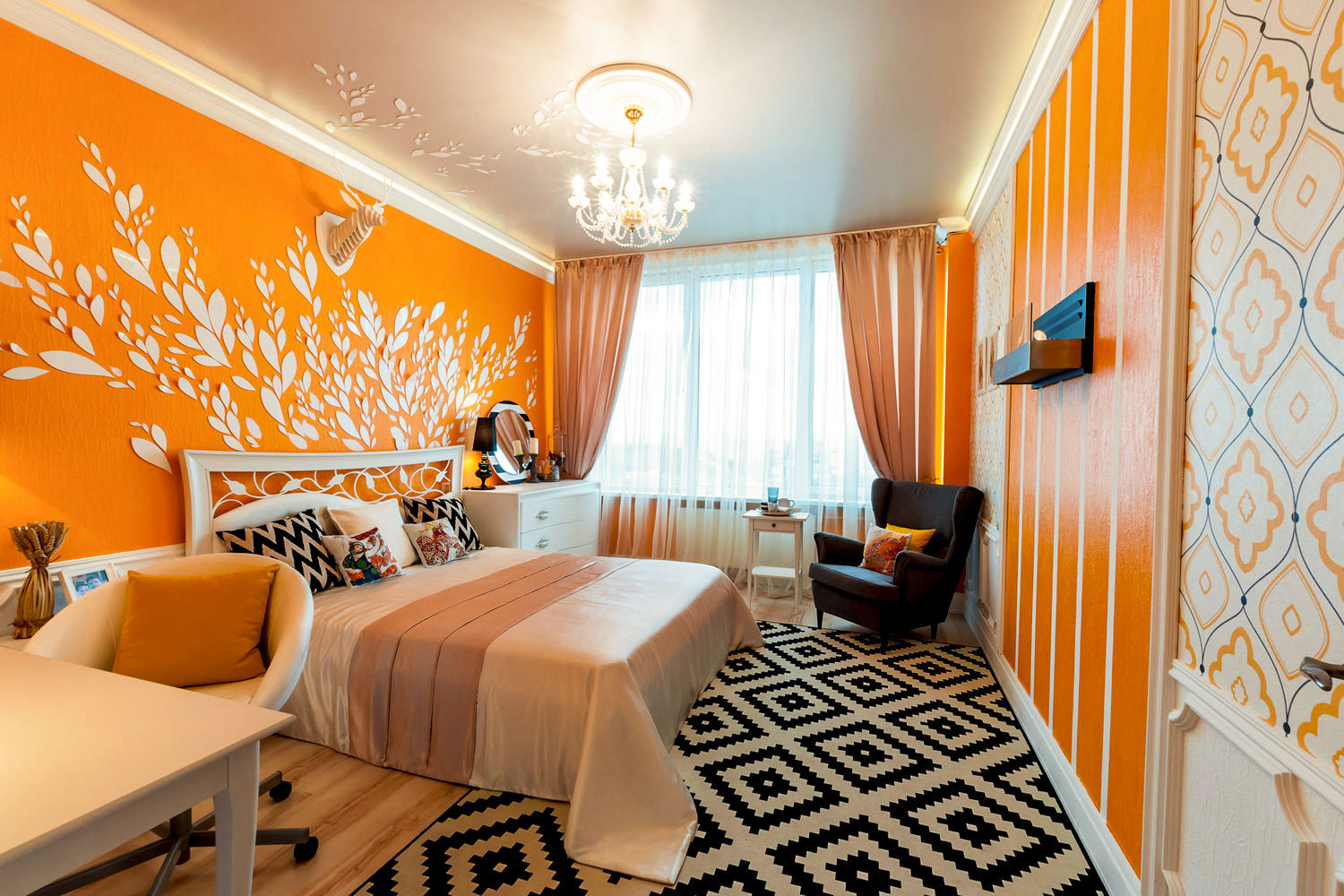 It would be possible to list ideas for a very long time. But it is no less interesting to point out interesting solutions. The light room in which one of the walls is decorated with a repeating geometric pattern looks very good. Dark furniture in harmony with the same dark floor.