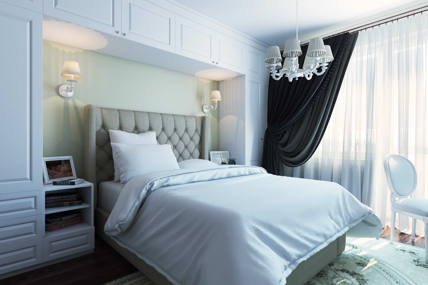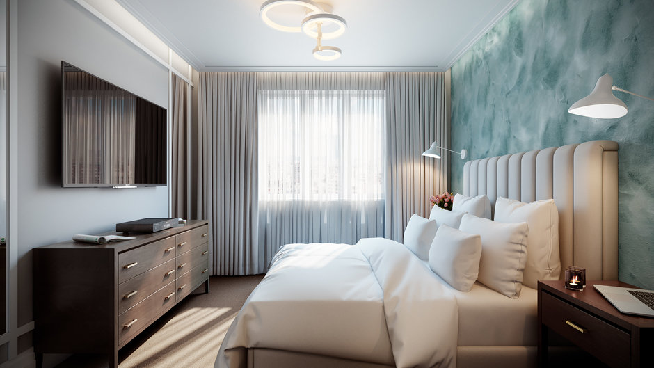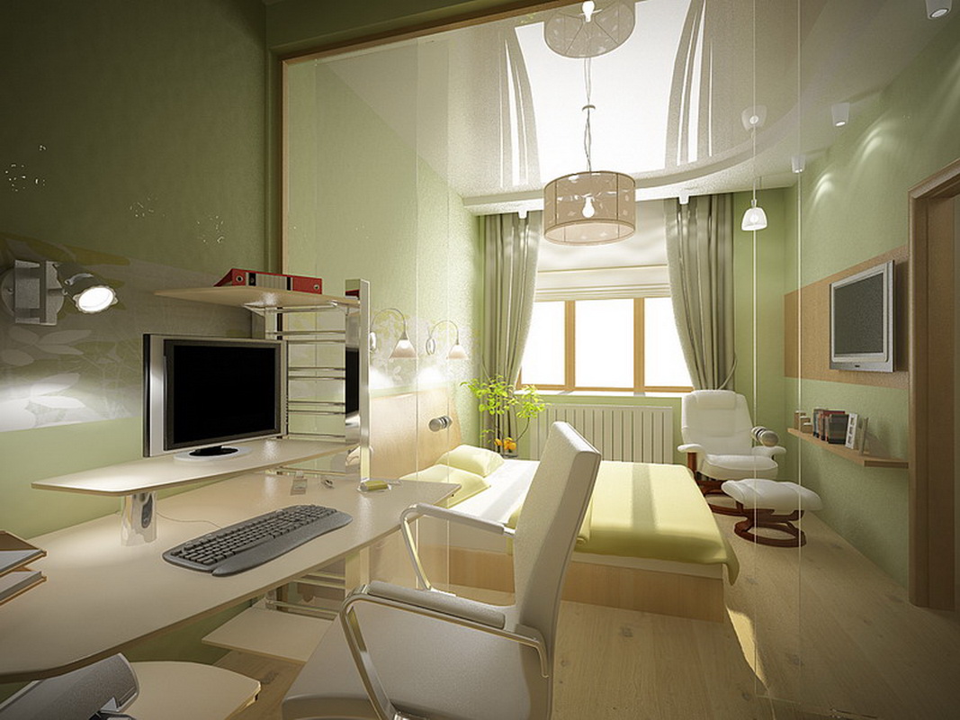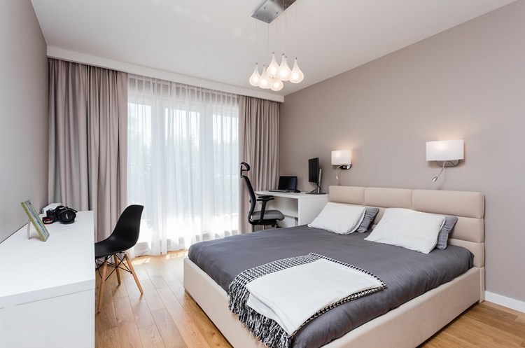 - Another option when everything is restrained and stylish. There is a compact place to work. Curtains, walls, bed are perfectly combined with each other in color. An interesting addition are the chandelier and lamps. Zest - a large window with simple curtains.