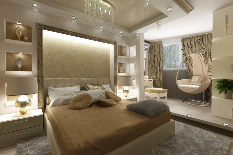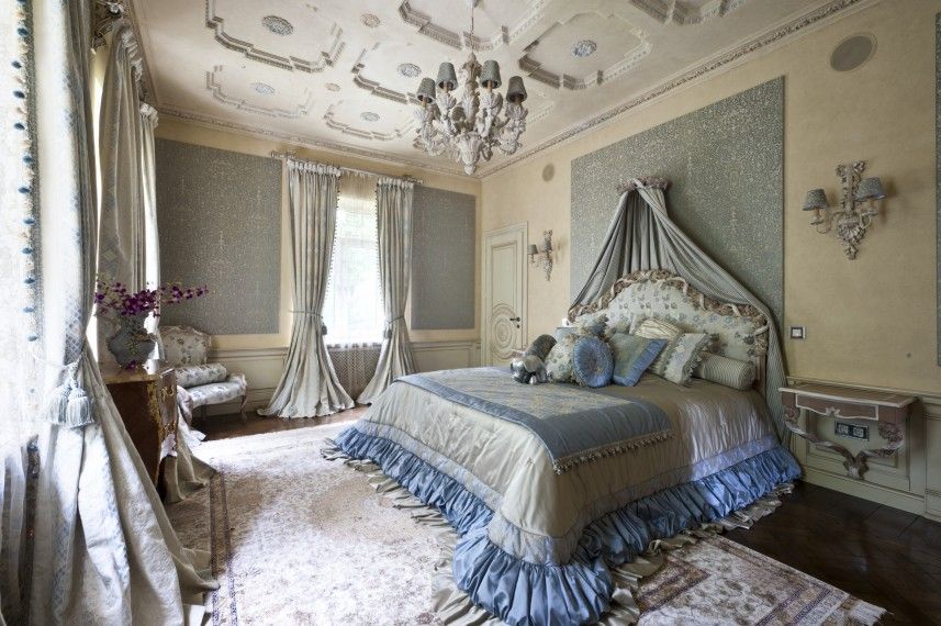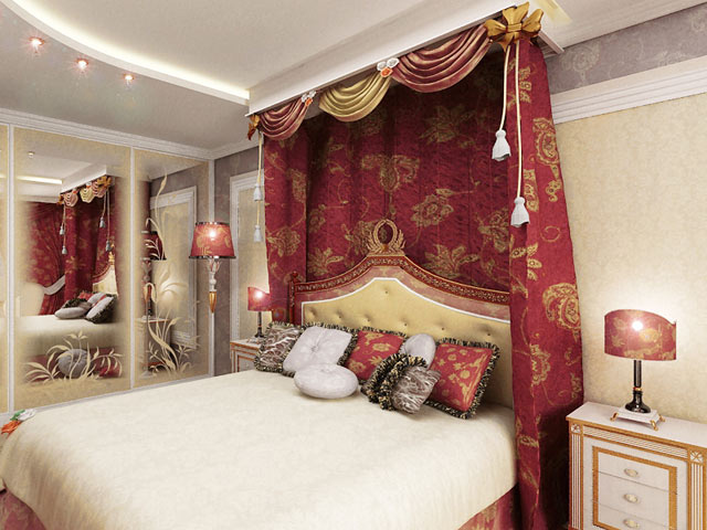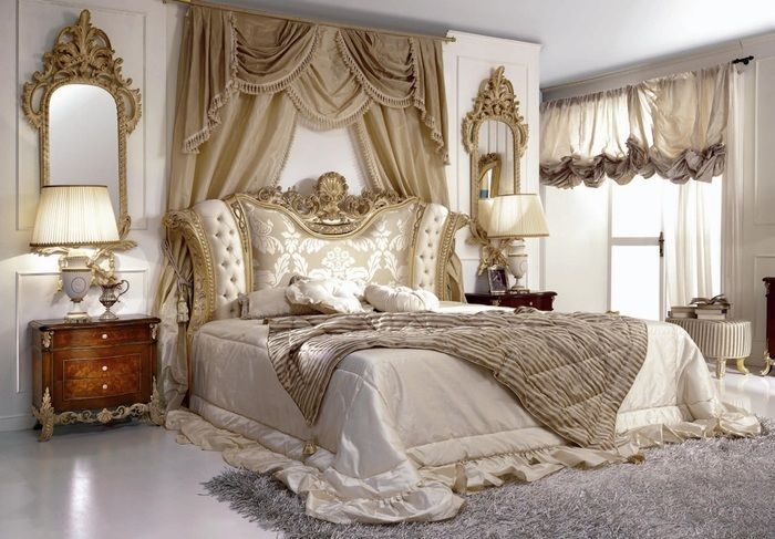 - Baroque. The desire to have a luxurious bedroom can be embodied in this particular style. Gilding, massive frames, mirrors, a chandelier, a large bed, a canopy, an expensive carpet - all this would be appropriate here.