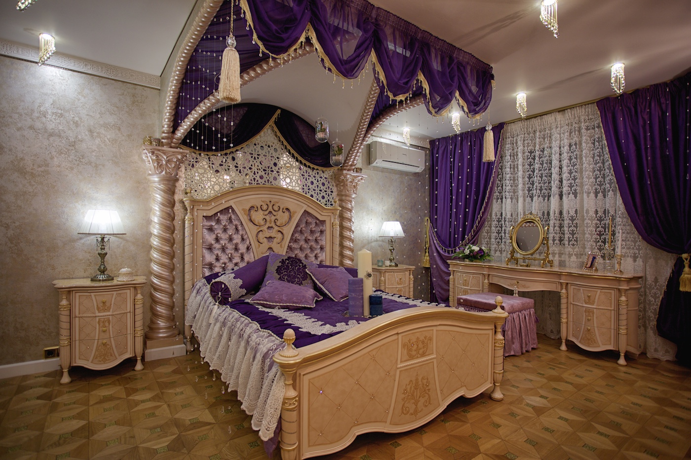 - Oriental. Suitable for those who want to feel like a fairy tale. Bright colors are possible here, like a large four-poster bed, and additional sofas, and interesting lighting solutions, and chic curtains. A large number of decorative pillows and silk bedspreads will come in handy.