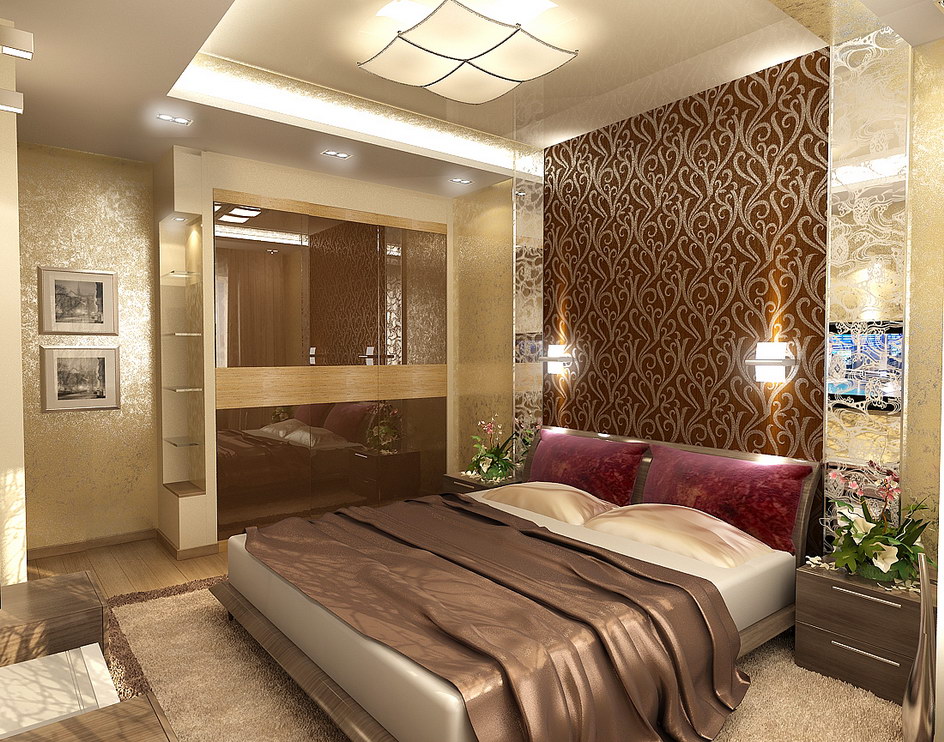 - The glitter of gold in combination with chocolate color gives a luxurious look to the bedroom. A big plus is the originally decorated ceiling, good lighting. From the elements of decor - paintings and flowers.