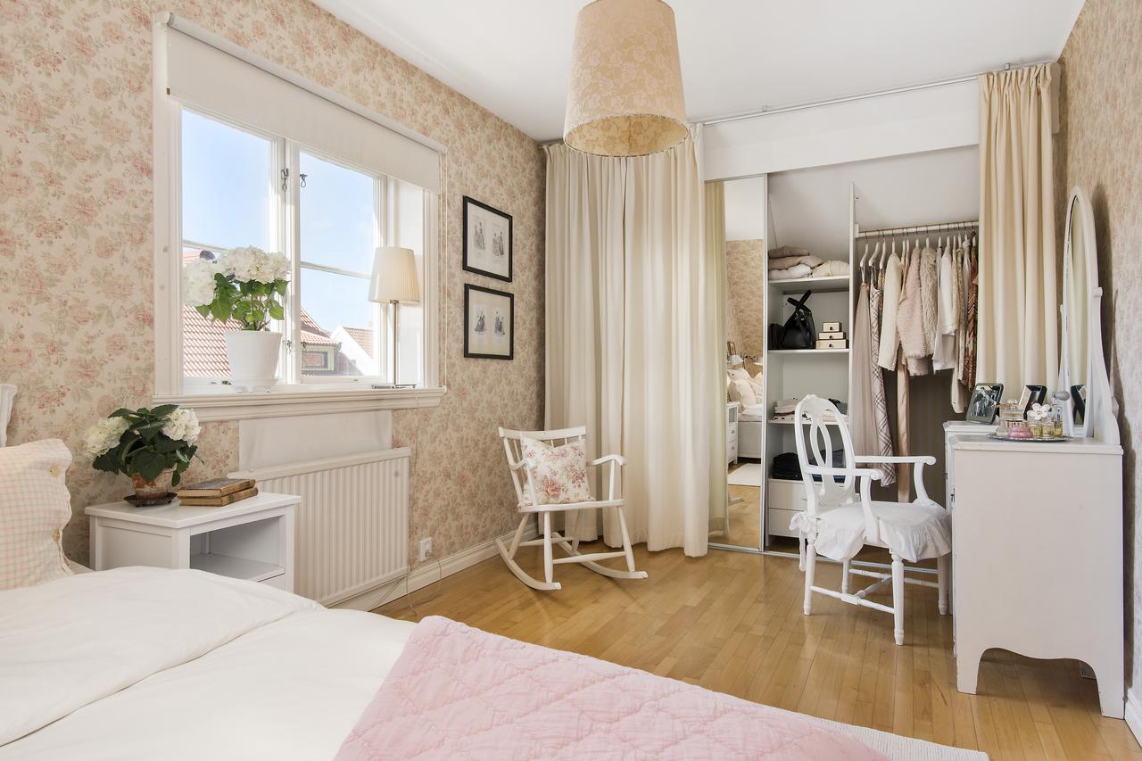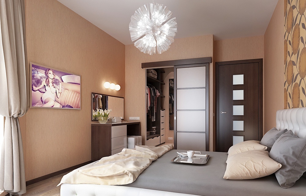 In the bedroom there is usually a wardrobe with clothes, which should also fit into the interior and have the appropriate design. Most often this is an important functional addition, but not the central subject on which to emphasize.