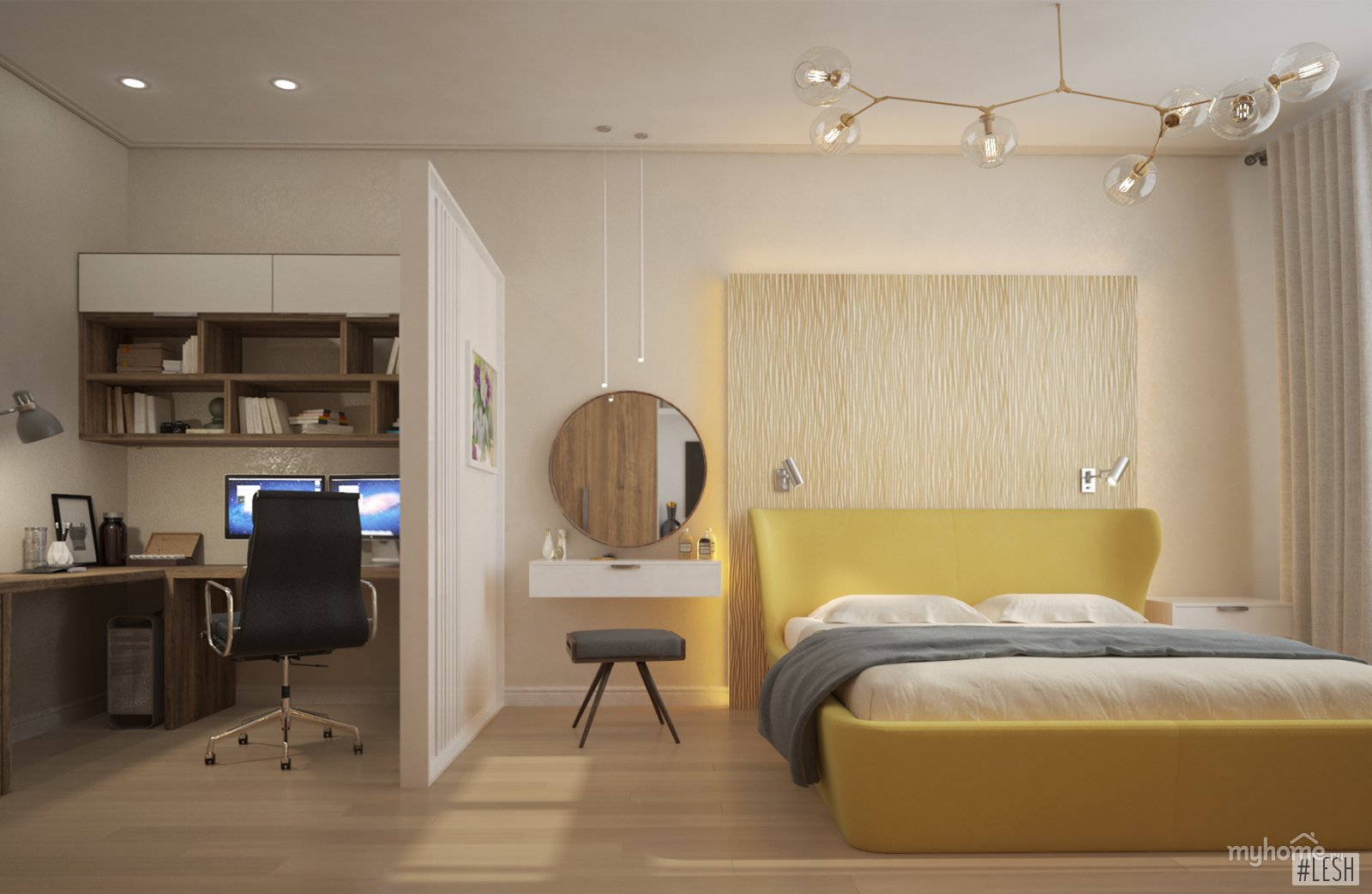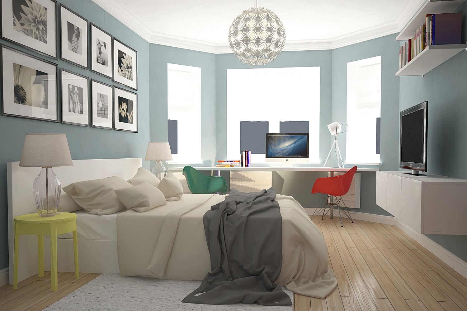 In one room it is easy to equip both the sleeping area and the workplace. It is enough to divide the room visually, and the bedroom will smoothly turn into a place to work.