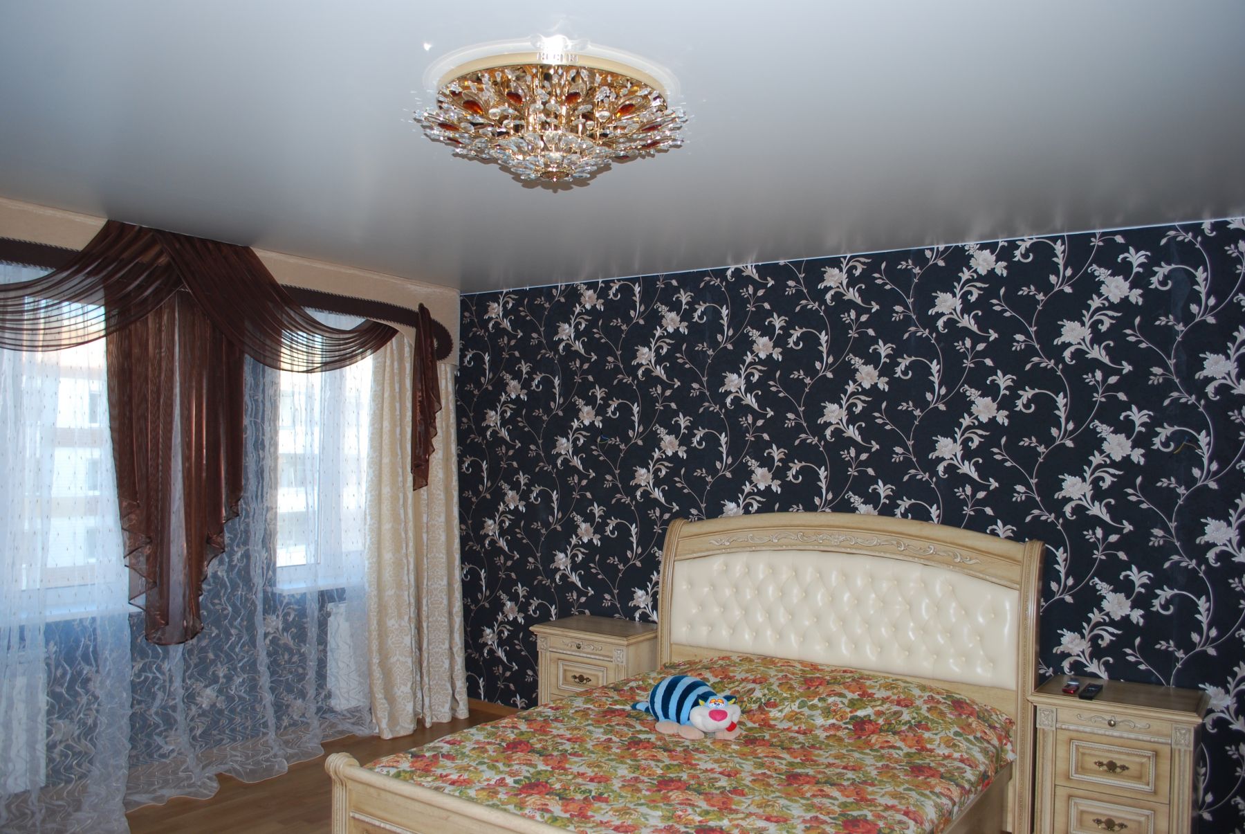 The most commonly used suspended ceiling, although there are design options and in the form of beams, wooden structures, using plaster, tile, wallpaper. Curtain ceiling - matte or glossy - will look harmoniously with any combination of materials for walls and floors. Multi-level ceilings for the bedroom can be used if they are quite high. If the ceiling is low, it is better to limit one level, but consider lighting, placing, for example, an original chandelier or beautiful lamps.