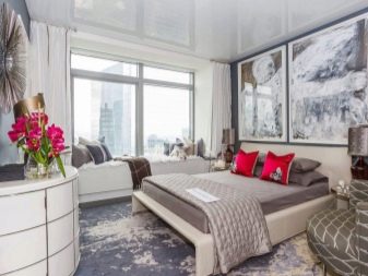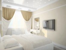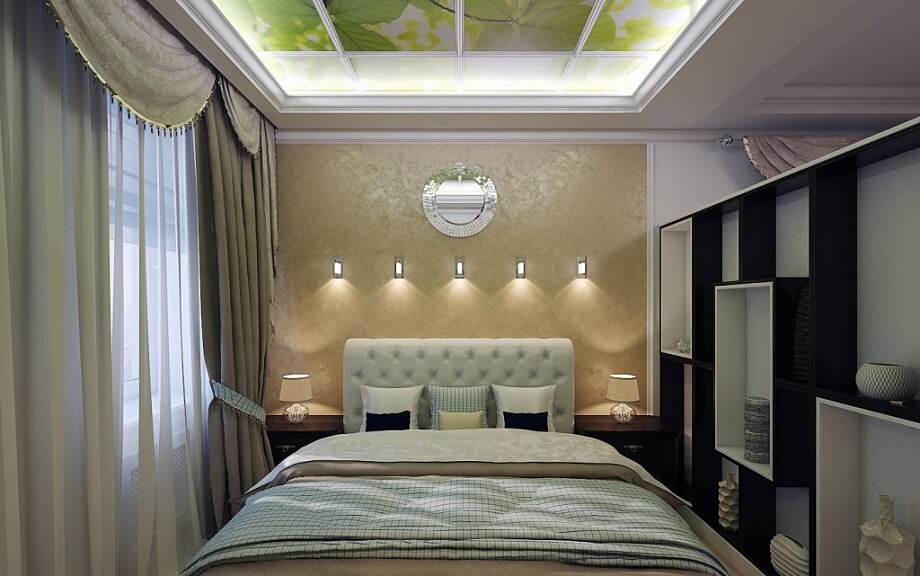 It is easiest to paint the ceiling of the 7-meter bedroom with white paint or to cover it with plaster of the same color. Any pastel shade would also be appropriate. The main thing is not to abuse the decor and three-dimensional elements, and not to use a multi-level system. Currently, quite often choose a stretch ceiling with a matte or glossy finish. This option surface design for a miniature room will be successful.