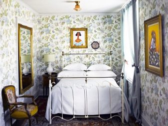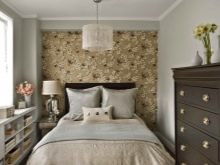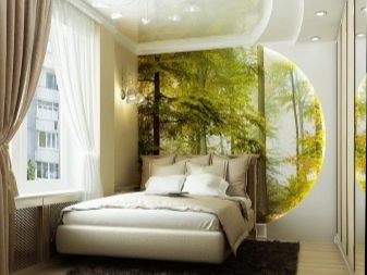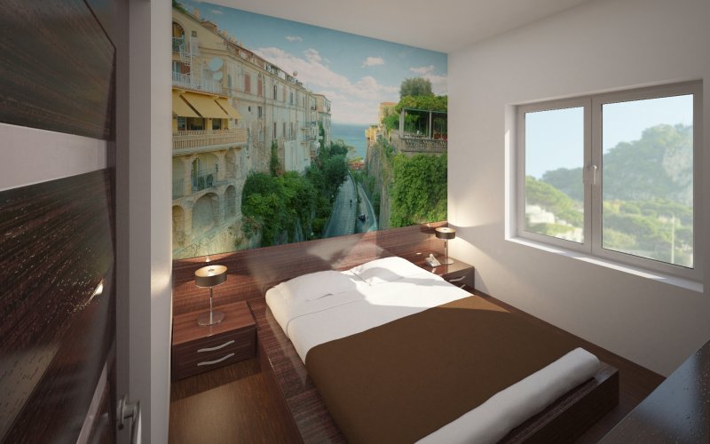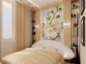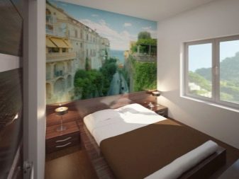 Quite often for the design of miniature bedrooms are used. photo wallpaper. The image should visually work on the expansion of space, for example, flowering fields, seascape, terrace, beyond which the city extends. It is important that the wallpapers match the overall style of the room and the color palette.