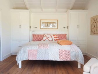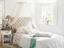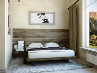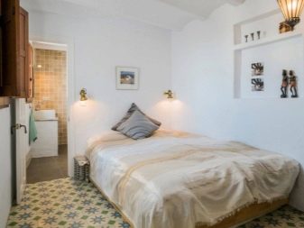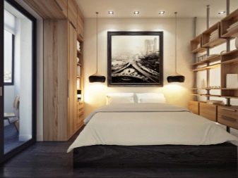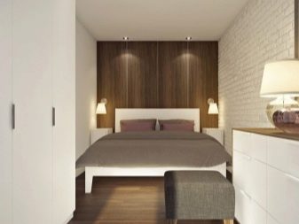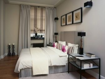 Bedside tables should better choose those that will be combined with the bed. Light and simple models are more suitable for a small bedroom, for example, in the form of tables on one leg or stools with an extra shelf. It is interesting to see hanging cabinets, as well as mounted shelves mounted directly above the headboard. They create additional storage space, they look interesting, but do not overload the space.
