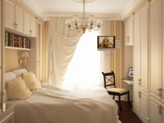 Small room with an area of 7.5 square meters. m allows you to use only multifunctional and fairly compact furniture. As a rule, for such a bedroom it is enough to have a bed of suitable size, spacious but not bulky closet, as well as miniature bedside tables. Do not add those items that are in the bedroom, in general, are not used, or those without which you can do. Cabinet should choose a model that has a depth of from 35 to 40 centimeters. They are not particularly deep, but allow you to place all the necessary personal items.