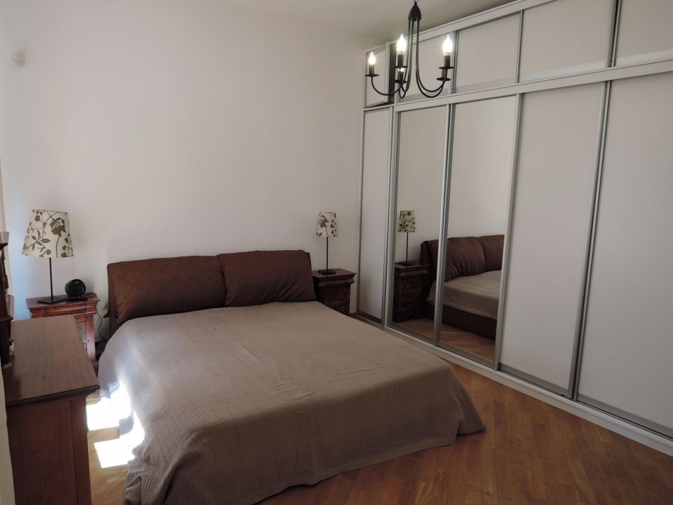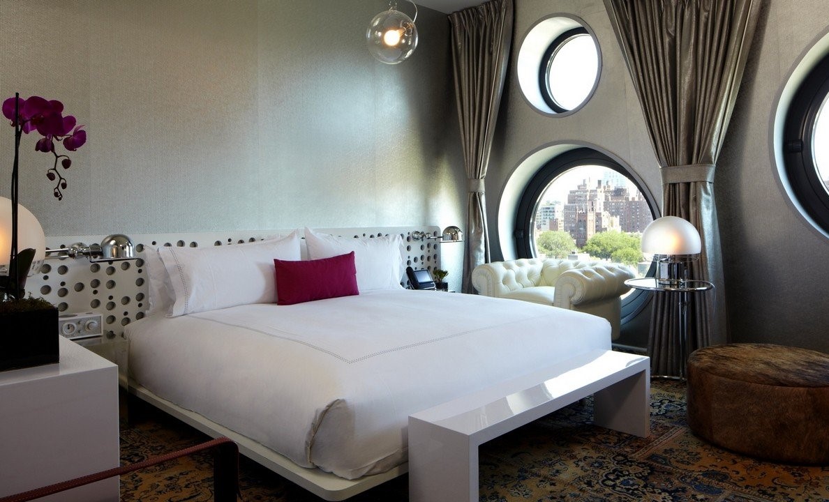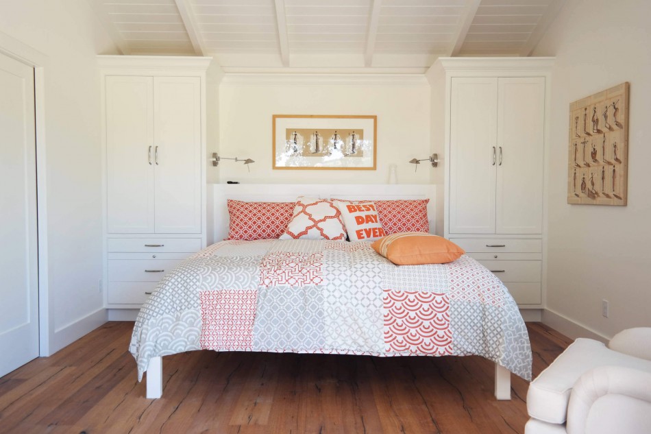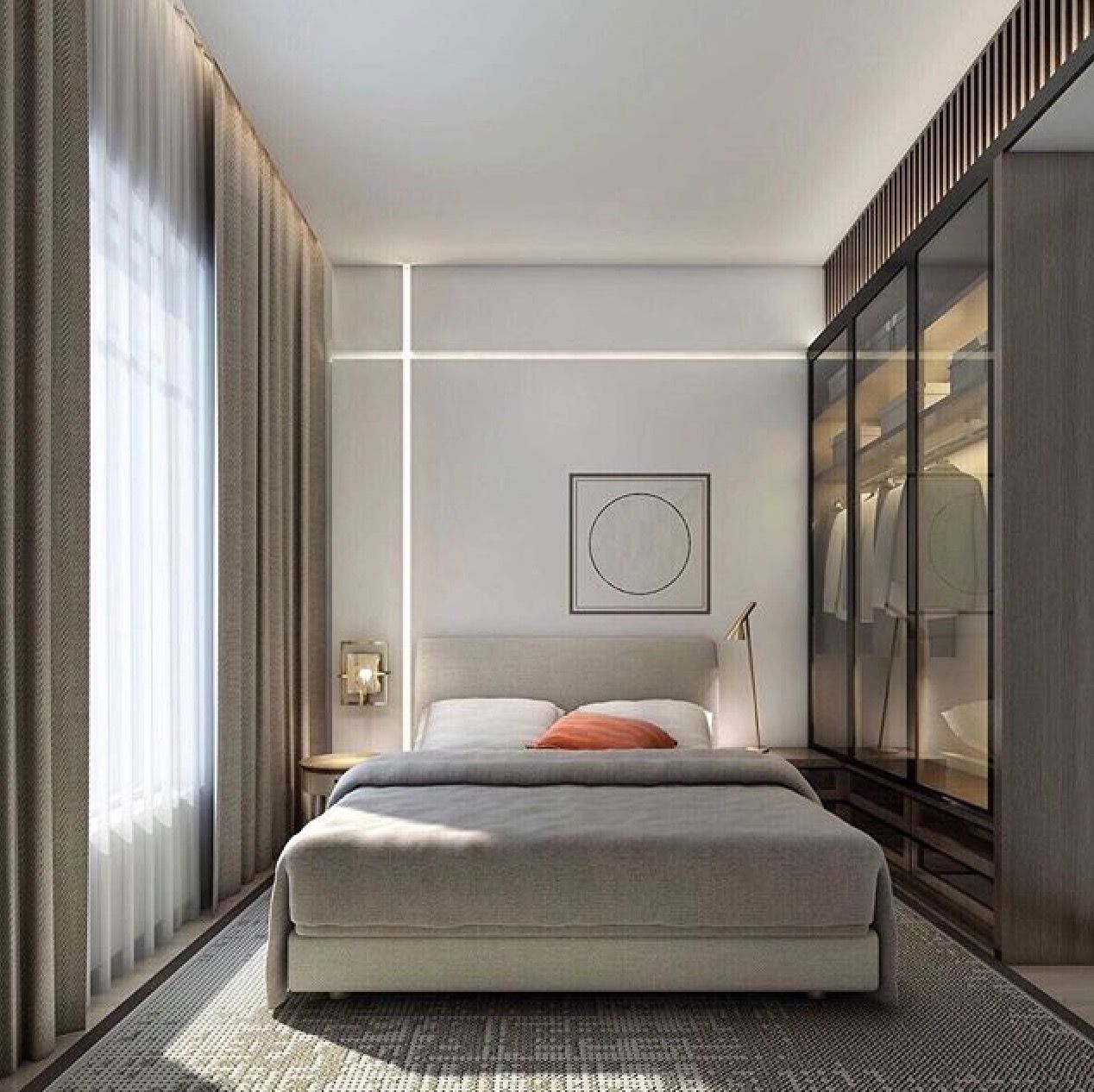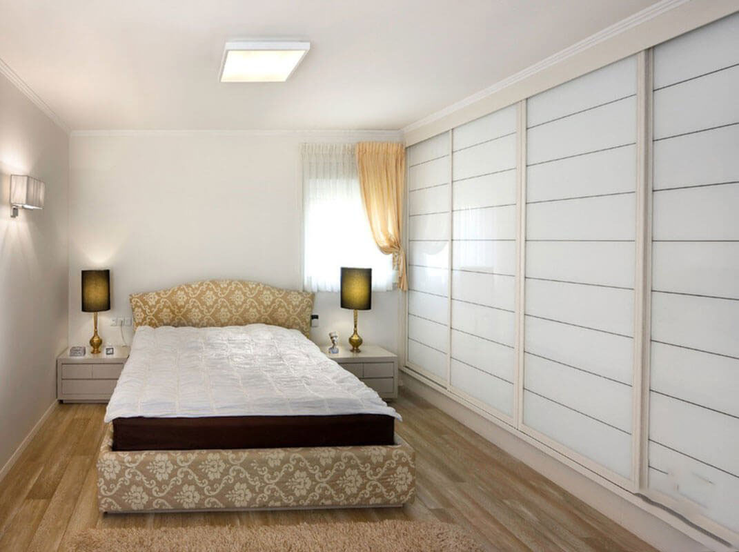 When the bedroom performs only the function of a place to rest, most often the bed is placed by the headboard either by the window or by a long wall. Free space is filled with furniture for storage.