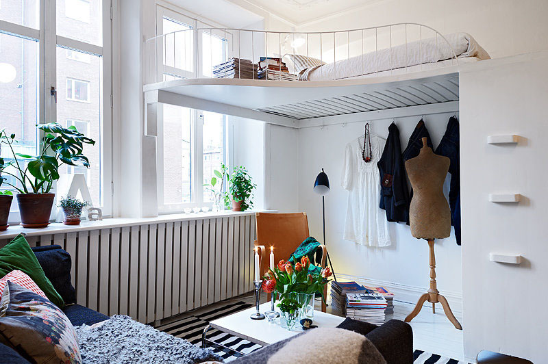 Creating a bedroom-living room with limited footage is a very difficult task, but it can be solved with high ceilings. In this case, the bed was removed under the ceiling, with the result that there was a space for storing clothes and a reading area at the bottom. Opposite is a sofa calm blue shade. White color is used as a color base, in some places supplemented with black stripes. The few décor is presented in blue and green colors.