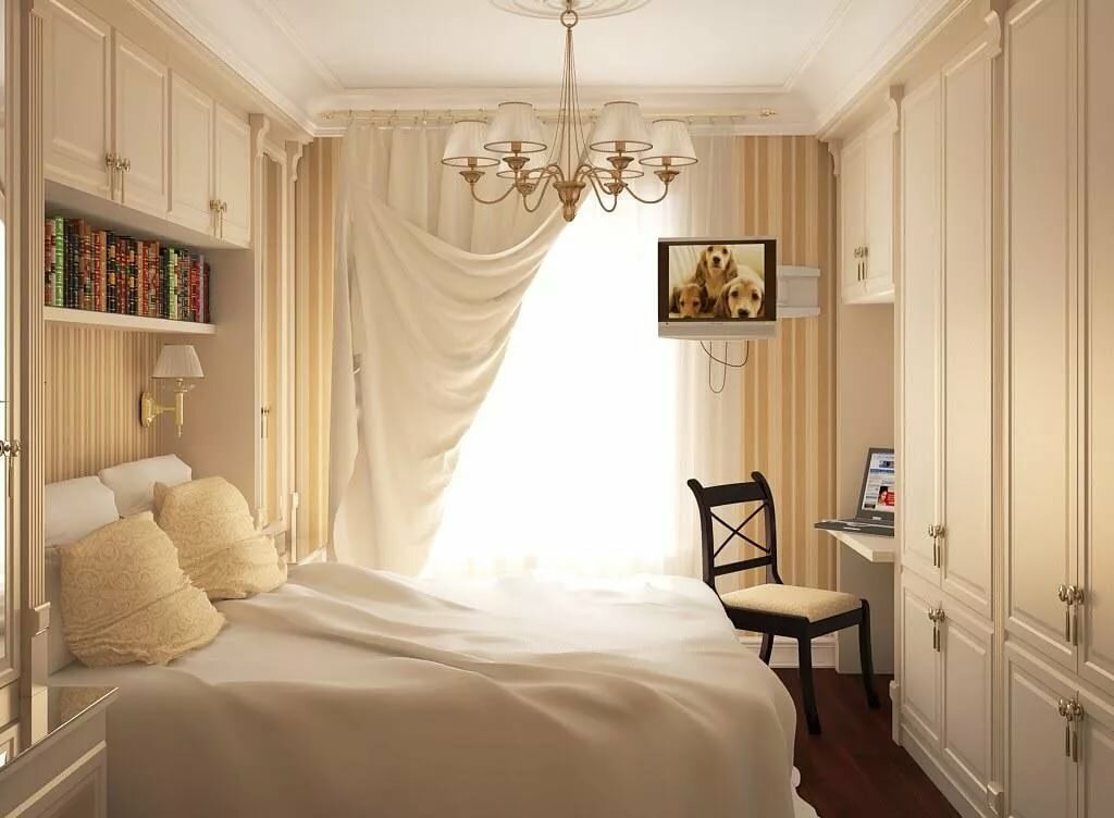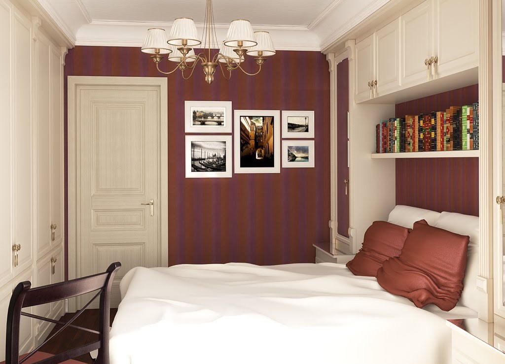 Bedroom, whose area does not exceed 8 square meters, is quite often found in Russian houses. Making it sometimes turns out to be a difficult task, since the small footage does not even allow the bed to be placed normally. therefore thinking through the project, it is necessary to choose the right colors, style, light, furniture forms to visually increase the space.