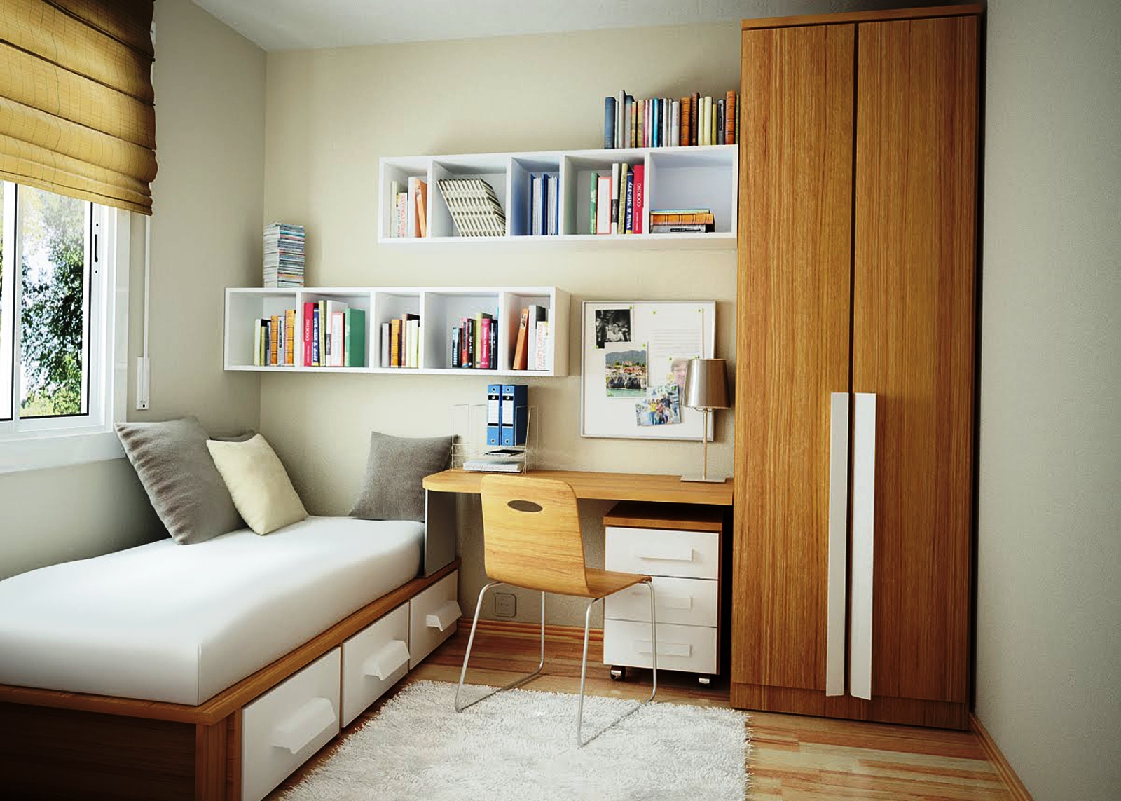 The bed is better to choose a simple one without protruding parts or excessive decor. Successful are models equipped with drawers in which you can store bed linen, towels or personal belongings. When placing a bed in a room, you should try to leave enough free space to use it, including drawer opening. A good solution would be a model with a lifting mechanism that opens storage space.