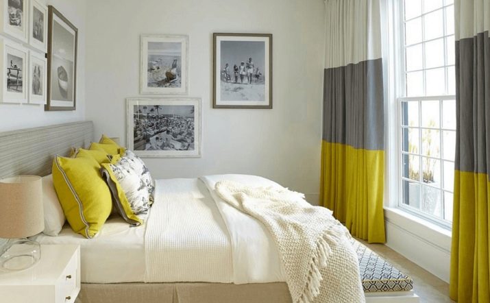 In this case, tricolor curtains are becoming a bright spot, combining white, gray and yellow, as well as a few yellow pads. The rest of the decor is a series of black and white photographs of various sizes, asymmetrically placed on the walls. The remaining space is occupied by storage space.
