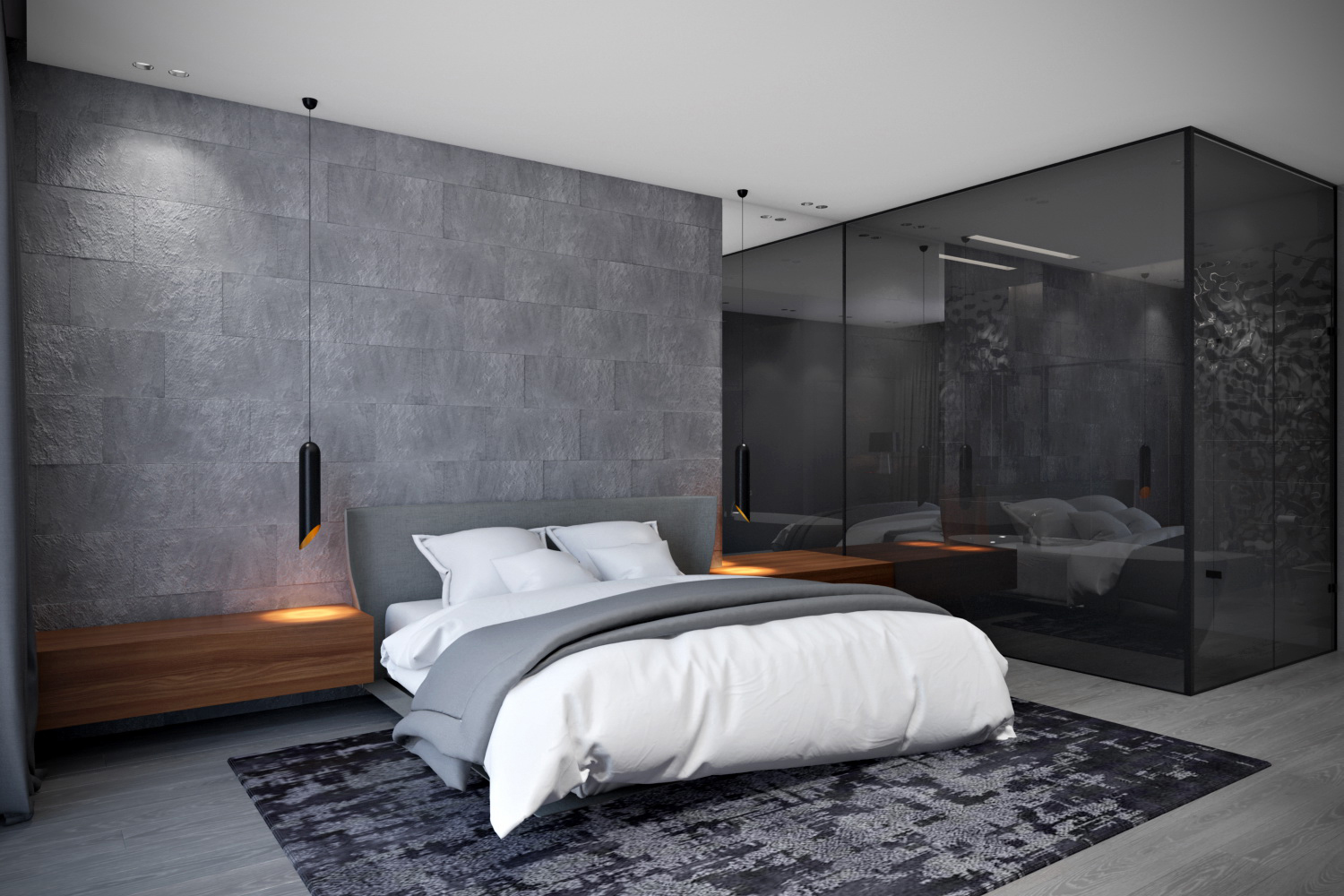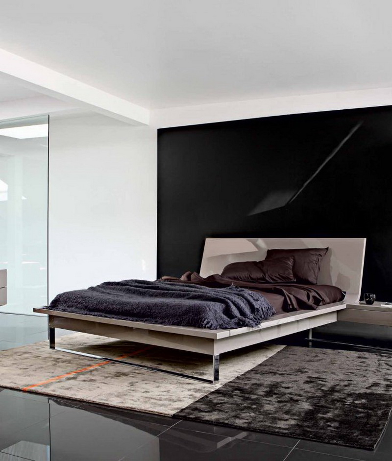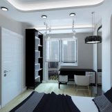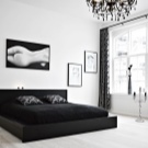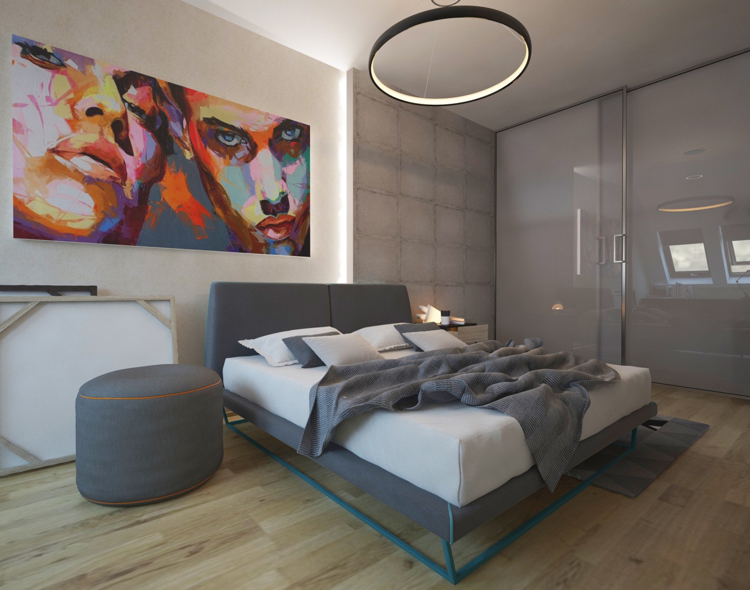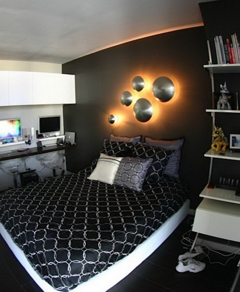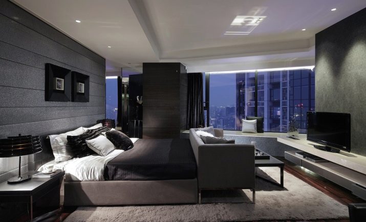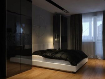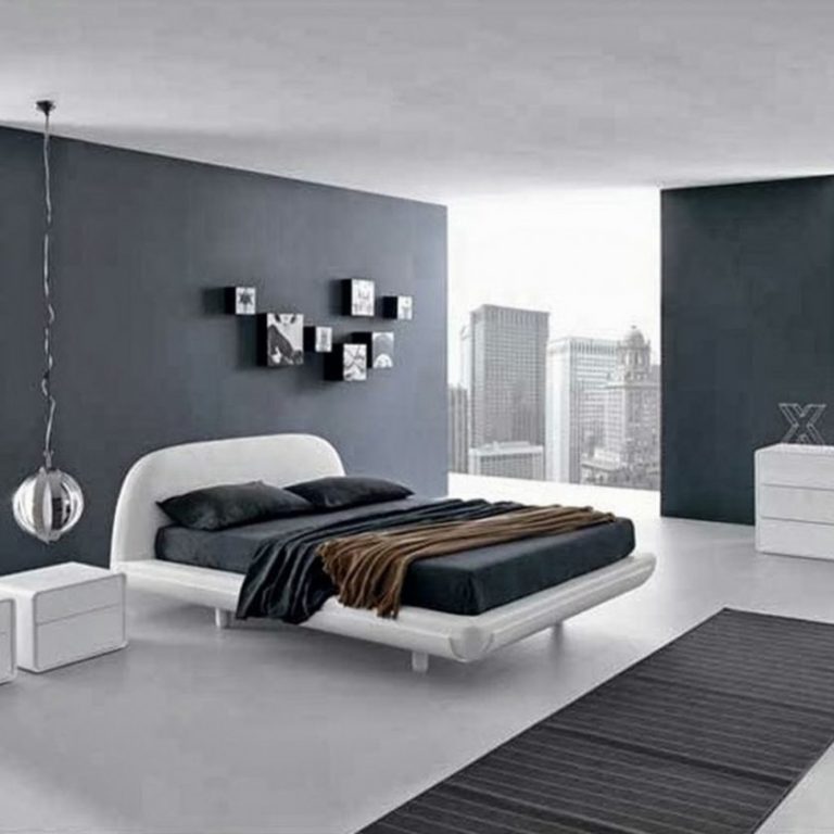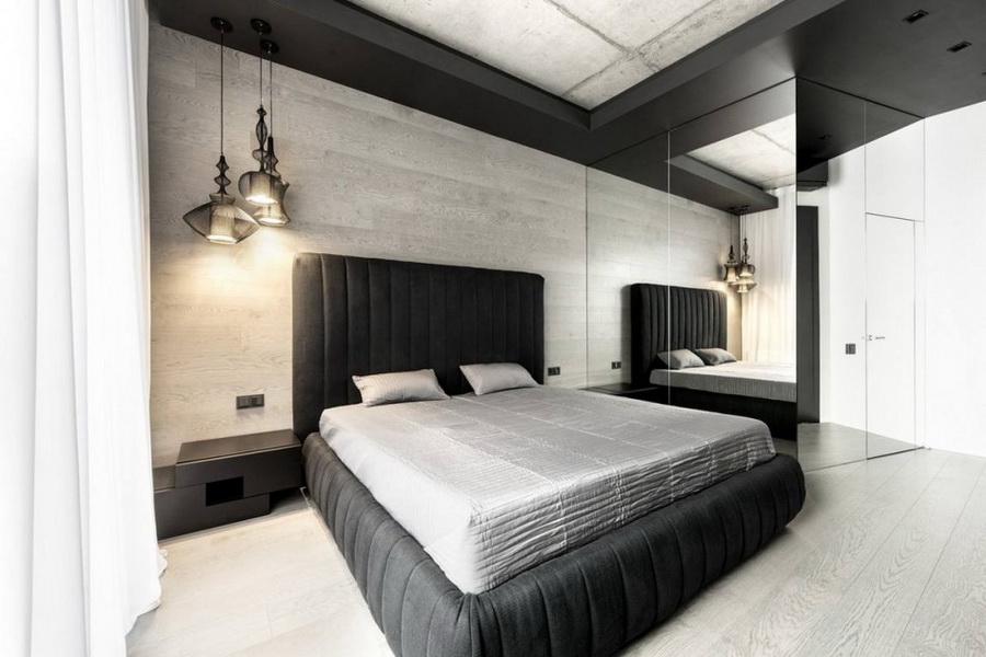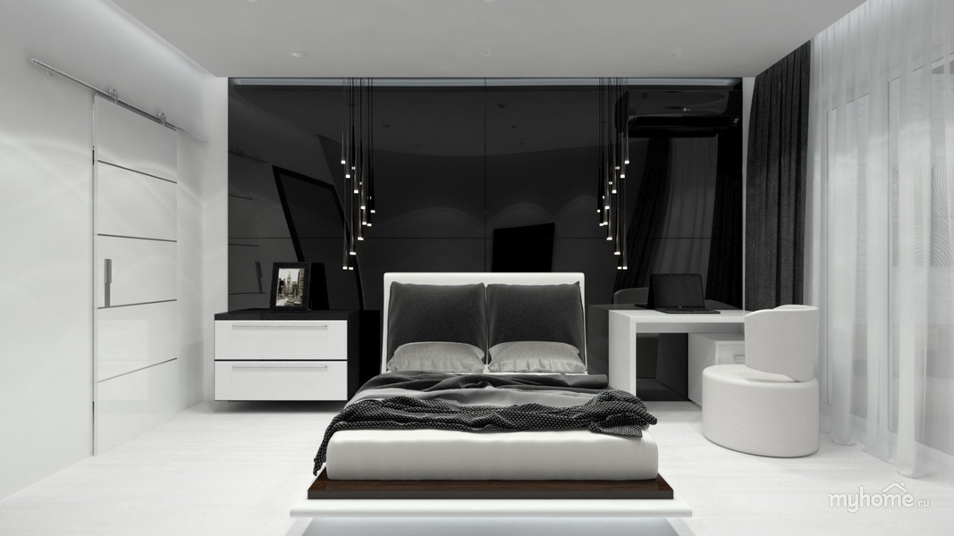 A combination of gray, white and black colors will be appropriate. The walls can be trimmed with panels of a metallic, gray-blue shade, the floor should be finished in the same color, but a lighter tone. Bed in this setting, you can put black and white bedding, and to the side of it against the wall to place a large black bookcase. Such a situation would be more appropriate if the room has large and tall windows.