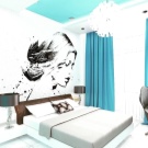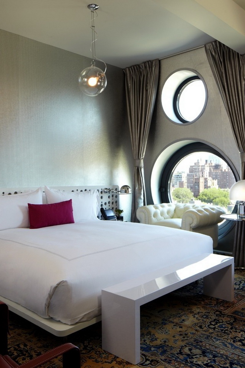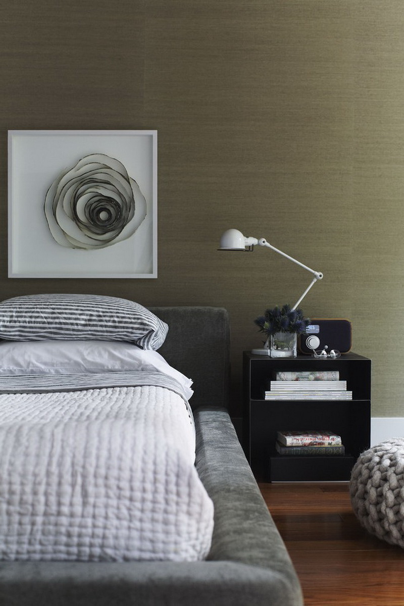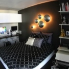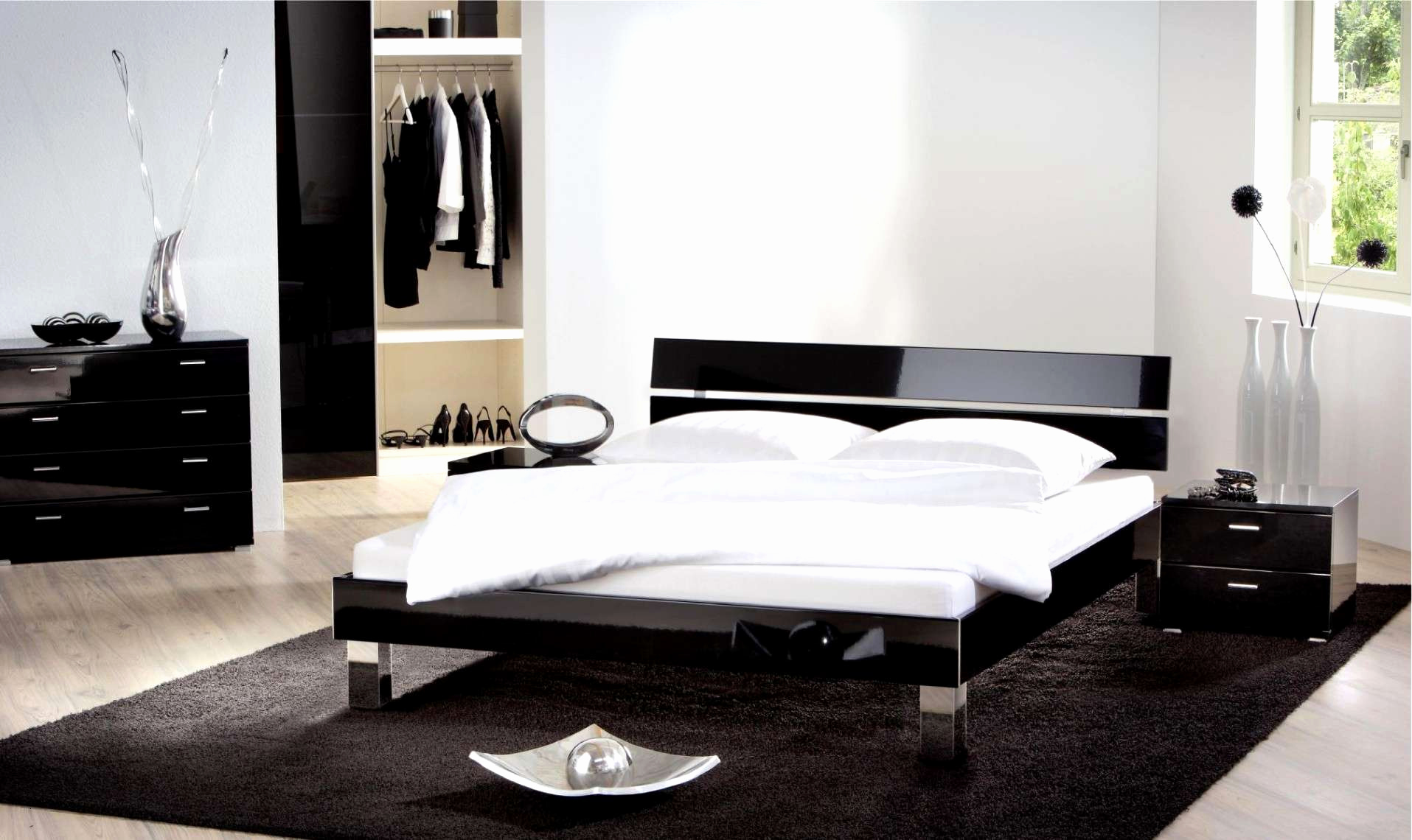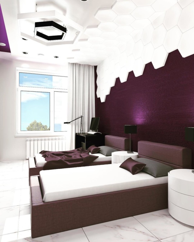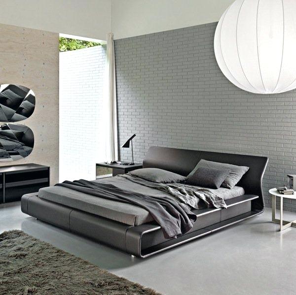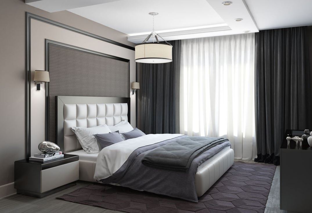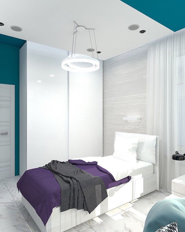 A combination of gray, white and black colors will be appropriate. The walls can be trimmed with panels of a metallic, gray-blue shade, the floor should be finished in the same color, but a lighter tone. Bed in this setting, you can put black and white bedding, and to the side of it against the wall to place a large black bookcase. Such a situation would be more appropriate if the room has large and tall windows.