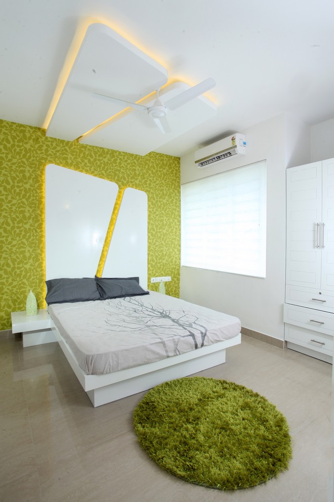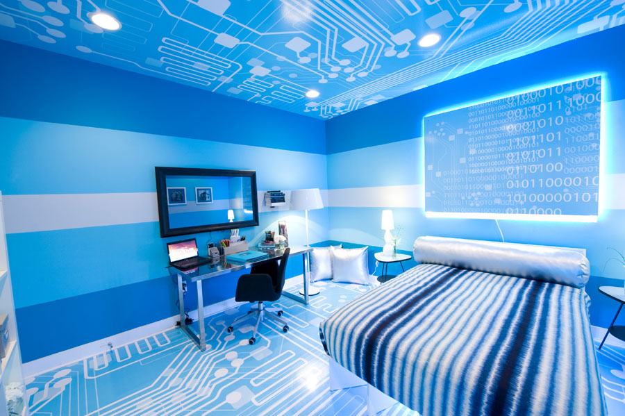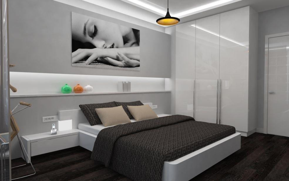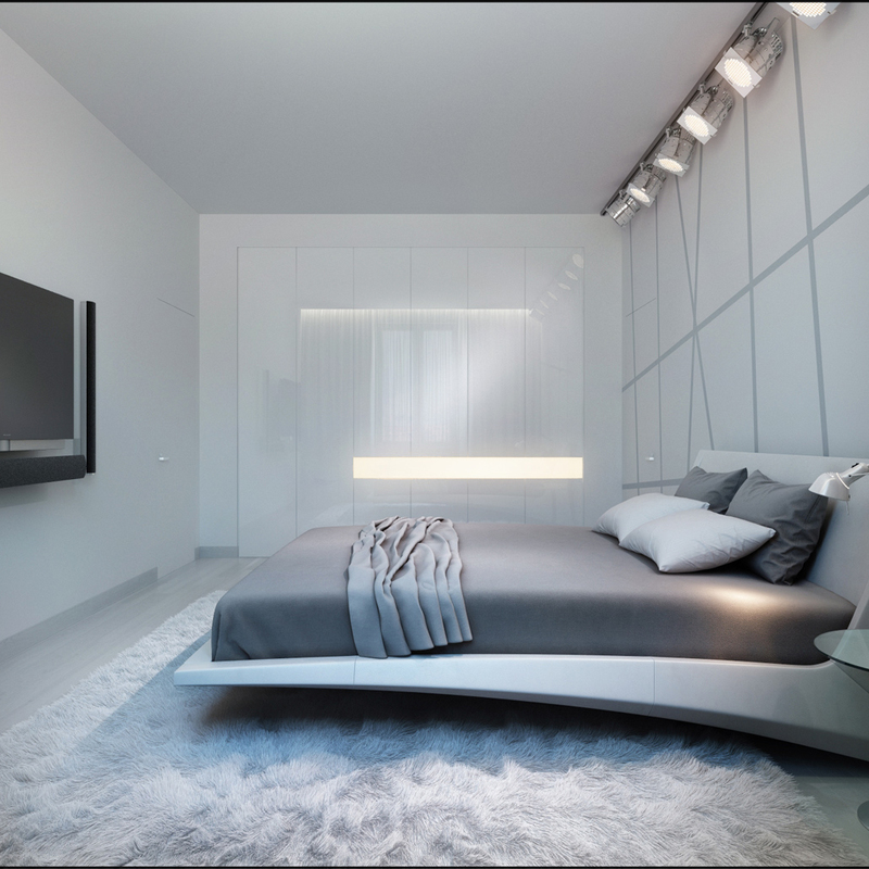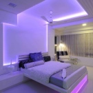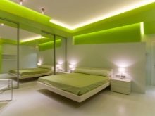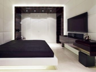 Hi-tech business card - hidden light sources. They are installed in niches, at the foot of the bed, along the shelves. Hidden LED lamps of different colors are able to visually "push" the room and divide it into separate zones, if necessary.