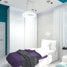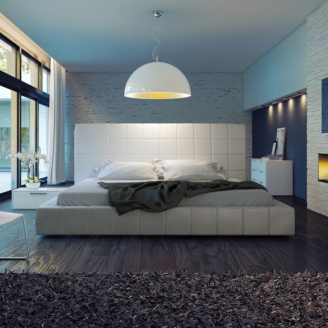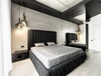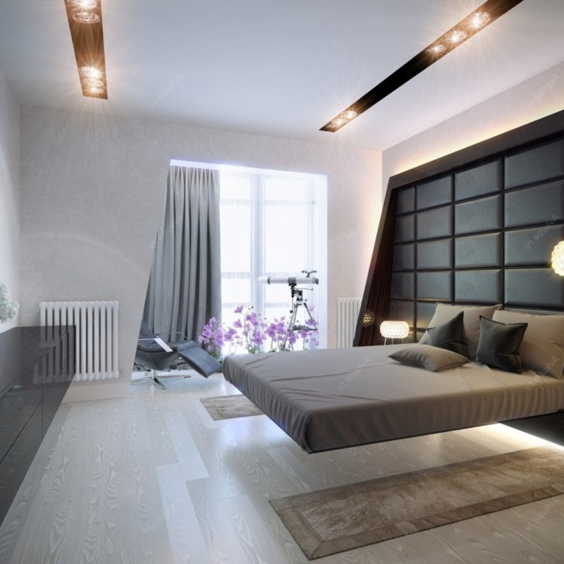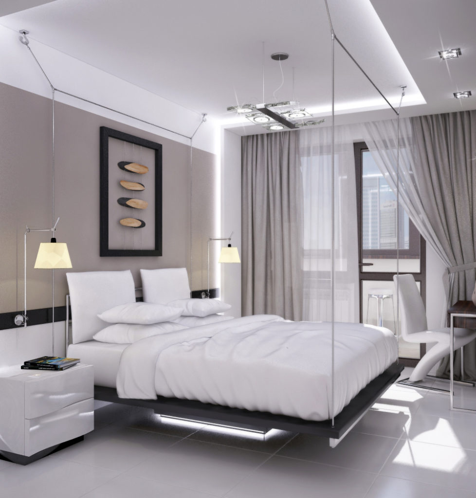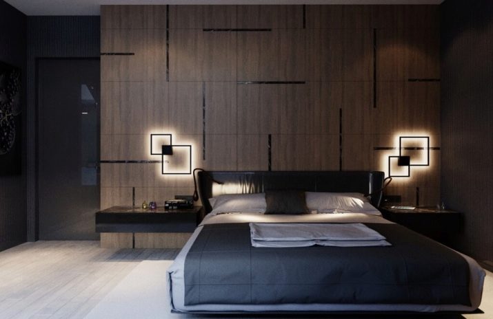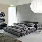 It is important to take care of good lighting in a progressive bedroom. Excess here will be a large crystal chandelier, as well as classic wall lamps with floor lamps. Optimal options will be flat and built into the ceiling or wall light bulbs that give even light. Suspended lamps of string type, fixed on strong metal brackets will be useful.