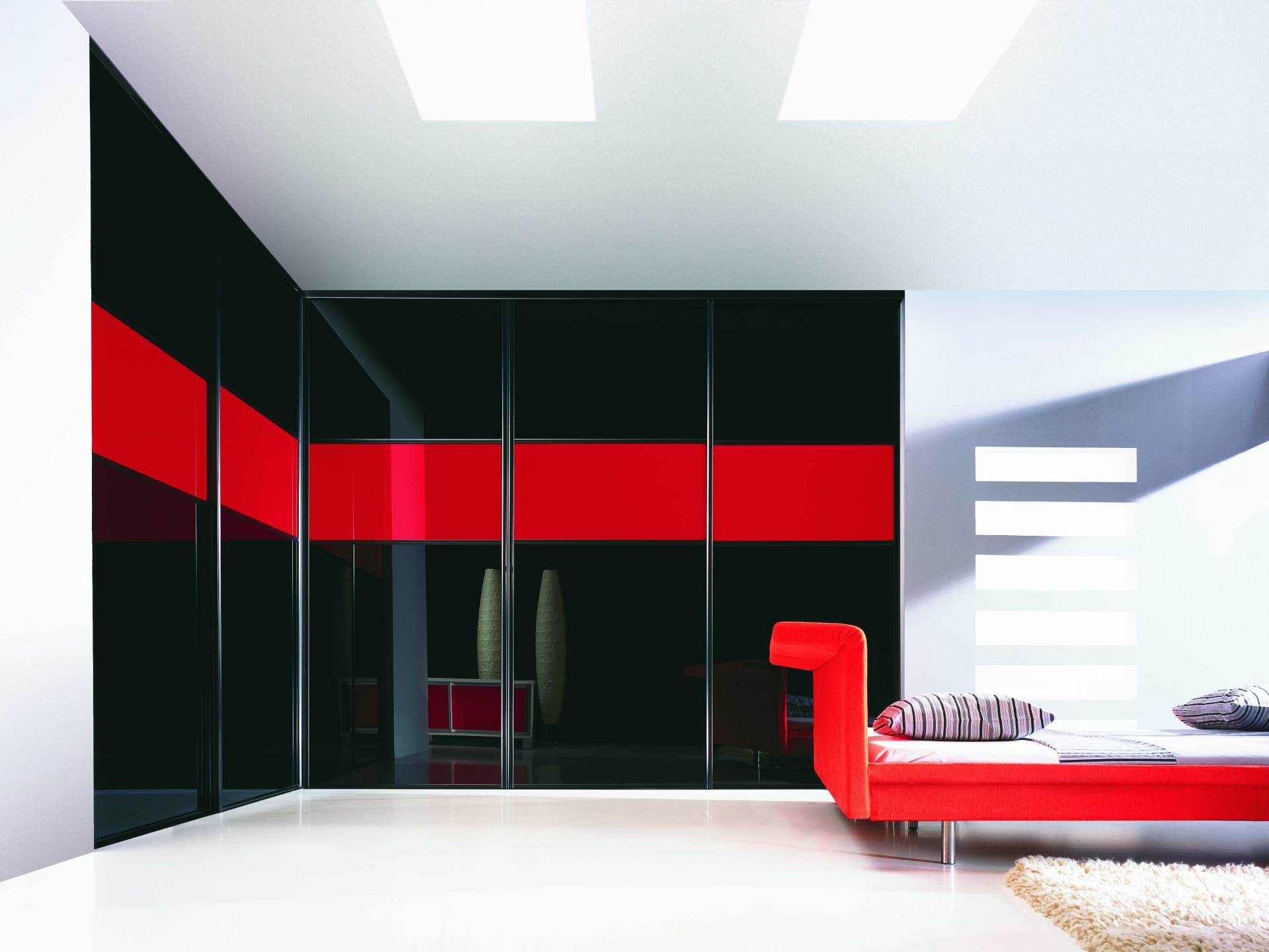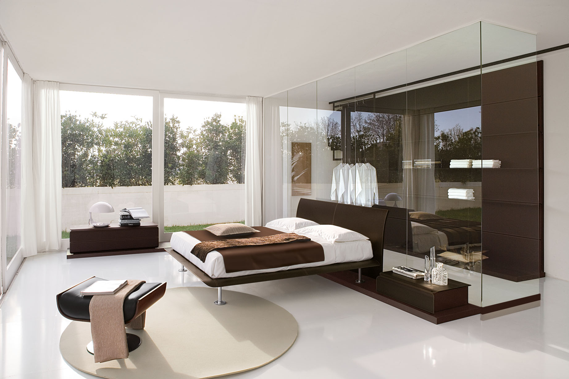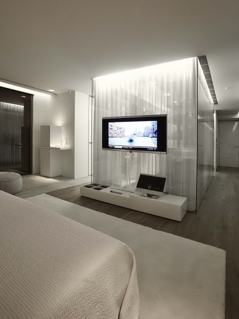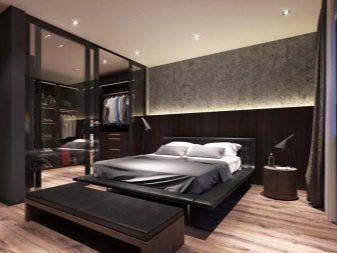 Do not do in the bedroom without wardrobe. They can be recessed or hidden in the walls, not conspicuous. And this is not about simple compartment lockers. Such options have long become boring and have become trivial, they will not surprise anyone, but banality is unacceptable in hi-tech. The trend is cabinets with hinged doors made of aluminum, radius and corner compartment models.