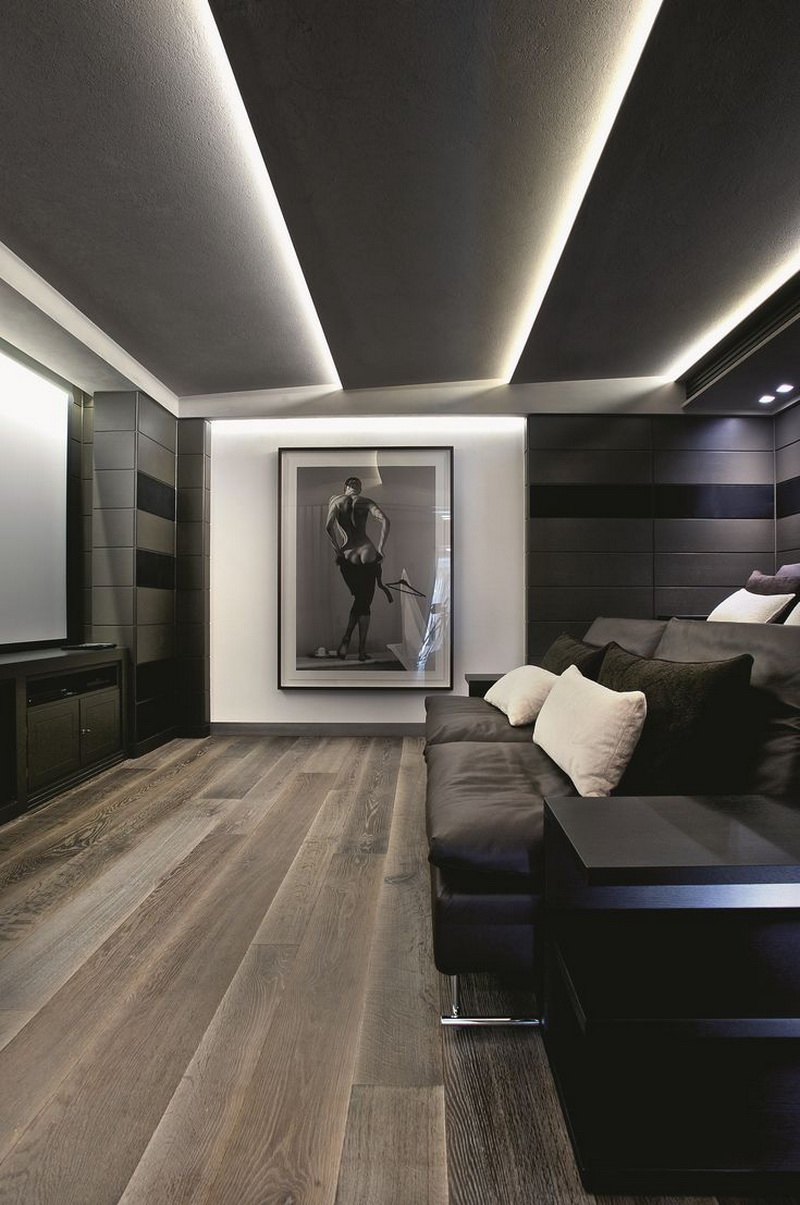Multi-level ceilings in such interiors look much more interesting if they are complemented with spotlights of different shapes (they are not only round).