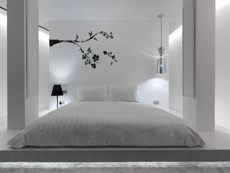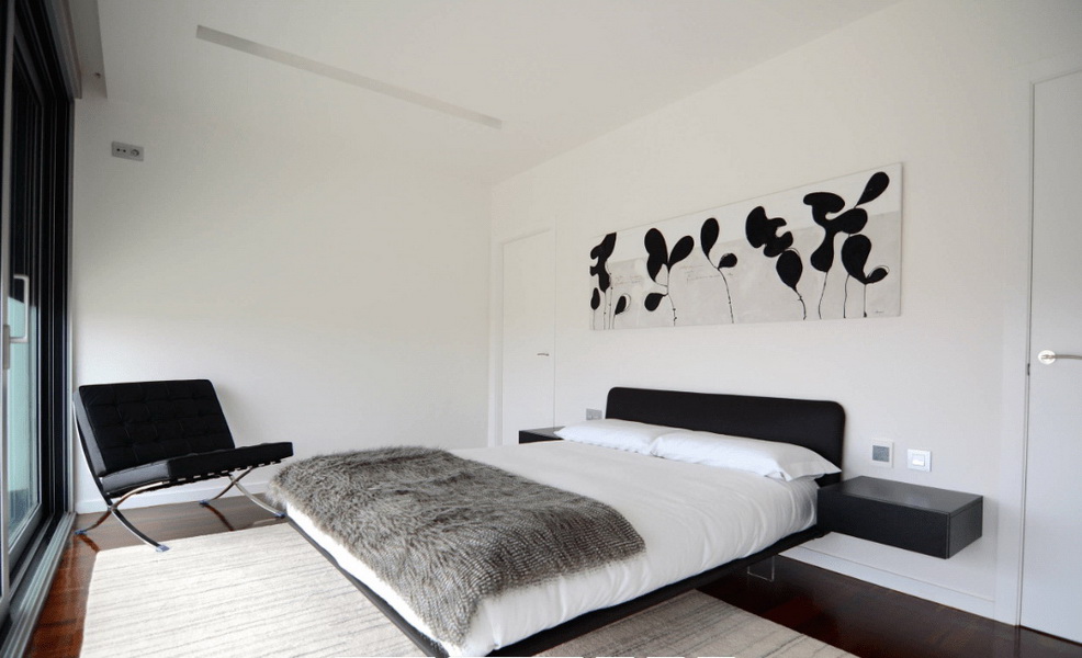 Particularly impressive are smooth bases, especially if they are glossy. So that after all the work the bedroom does not seem too boring, monotonous and “sterile”, you can resort to adding accents, for example, black and white photographs on the background of plain walls. It is permissible to resort to more sophisticated solutions in the decoration of wall foundations.