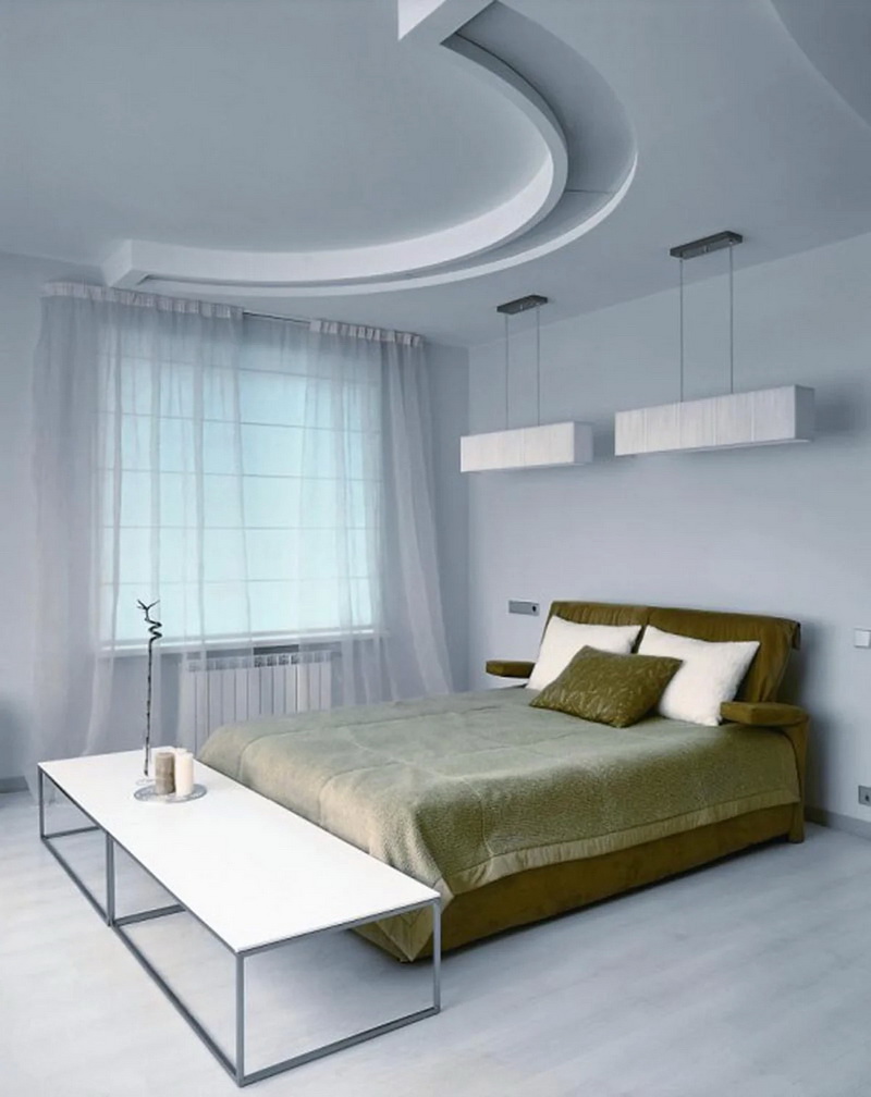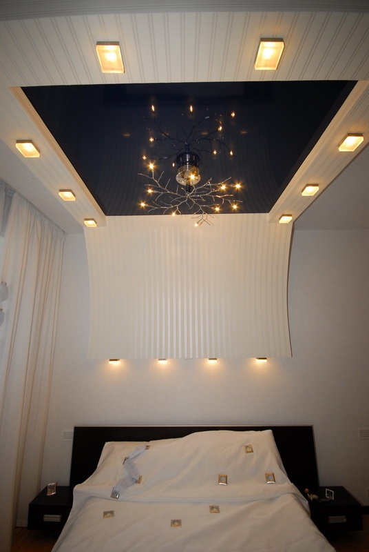 For a modern bedroom, not only popular multi-level ceilings will be appropriate. This base is allowed to finish with plastic panels, alternating them with metal, glass or chrome-plated elements. Such solutions are original and unusual.