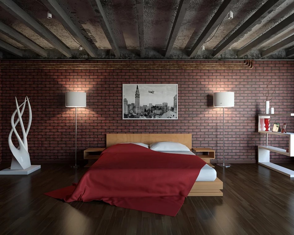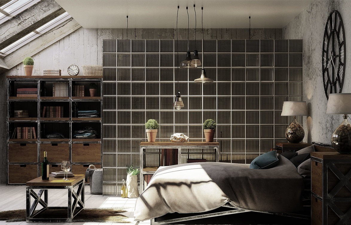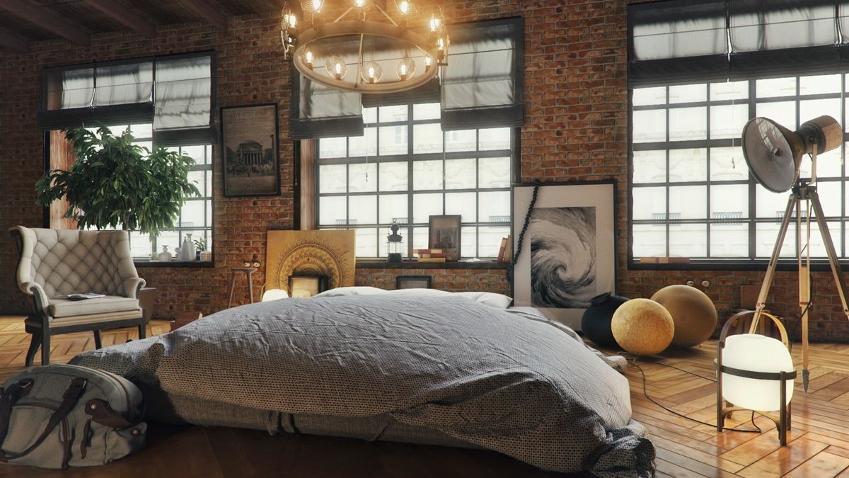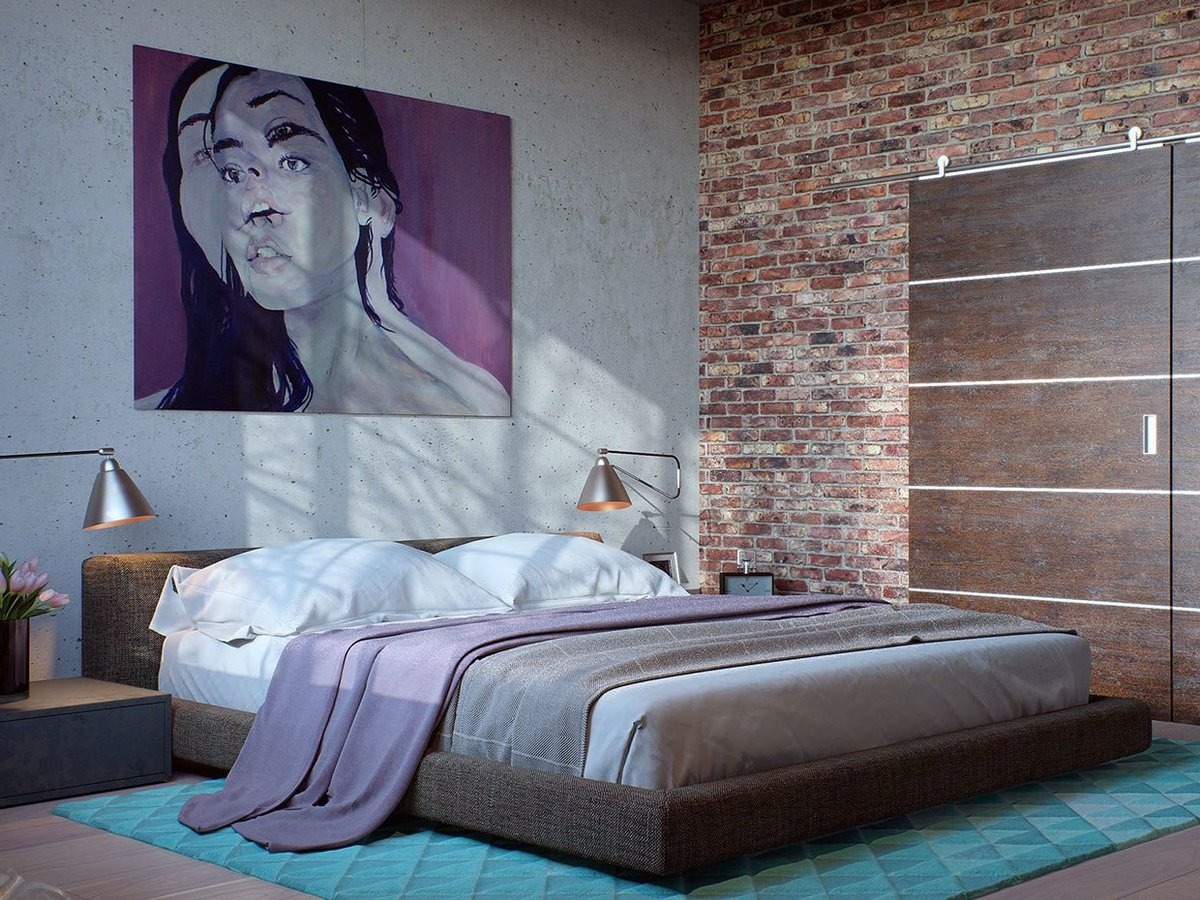 The idea of adapting an industrial object as a living space was the basis of the loft style. The fundamental features of the bedroom interior in this style today are certain features that make the style recognizable. For example, these include: