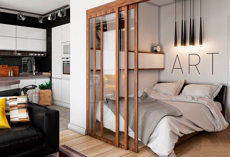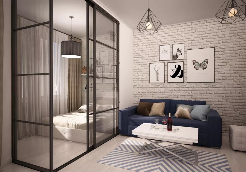 Cool will look in the bedroom style loft and a partition of glass blocks. Also under the sleeping island you can take space under the ceiling (in layouts with a bunk type of space). Someone likes the use of space under the bedroom under the stairs. As for the choice and placement of the rest of the furniture, everything will depend on the size of the room and the preferences of the customer.