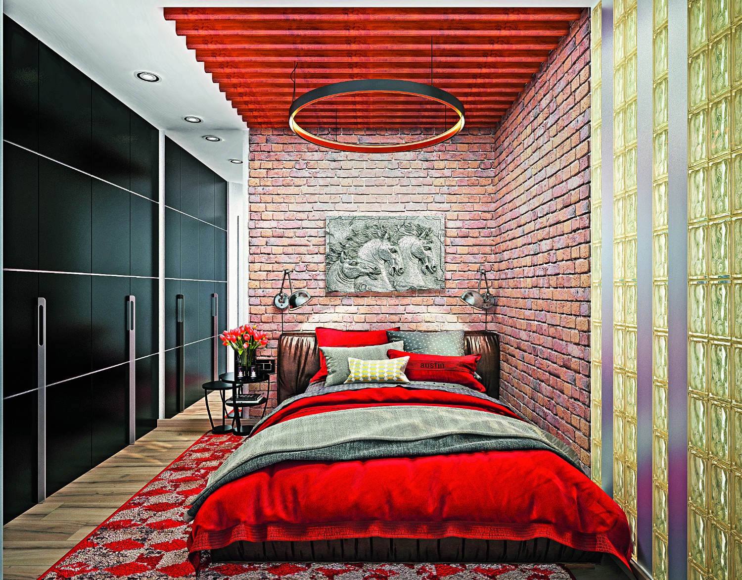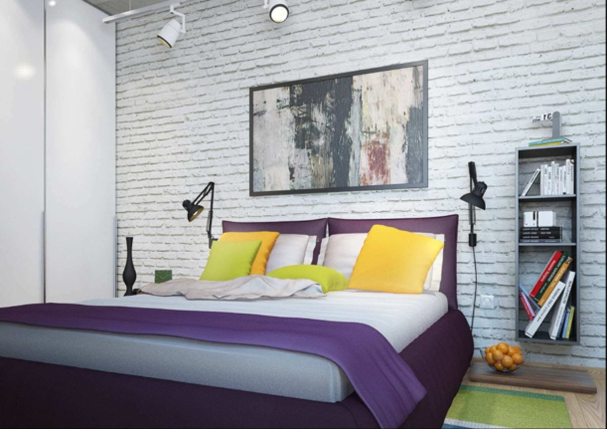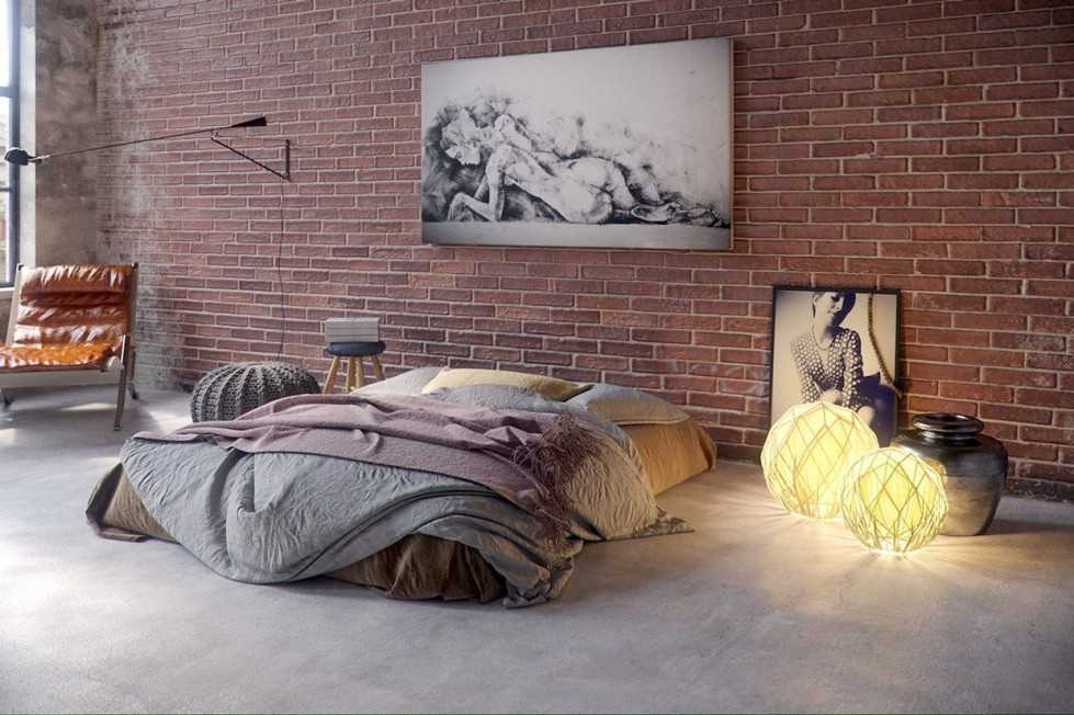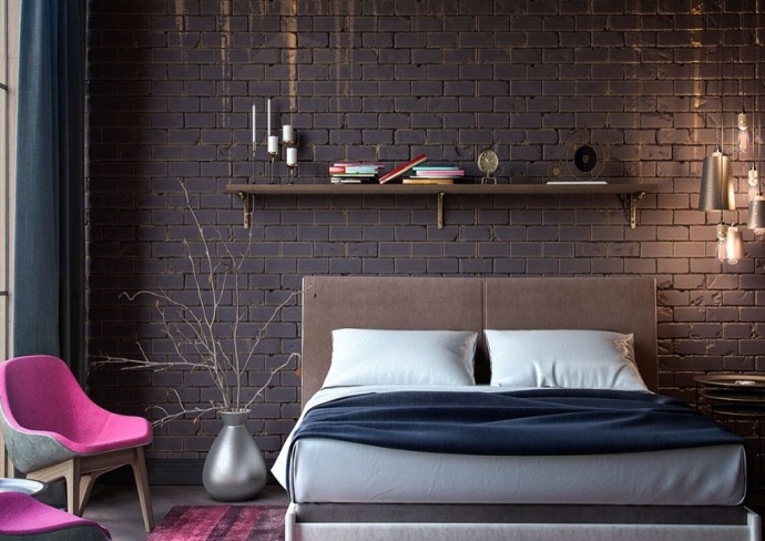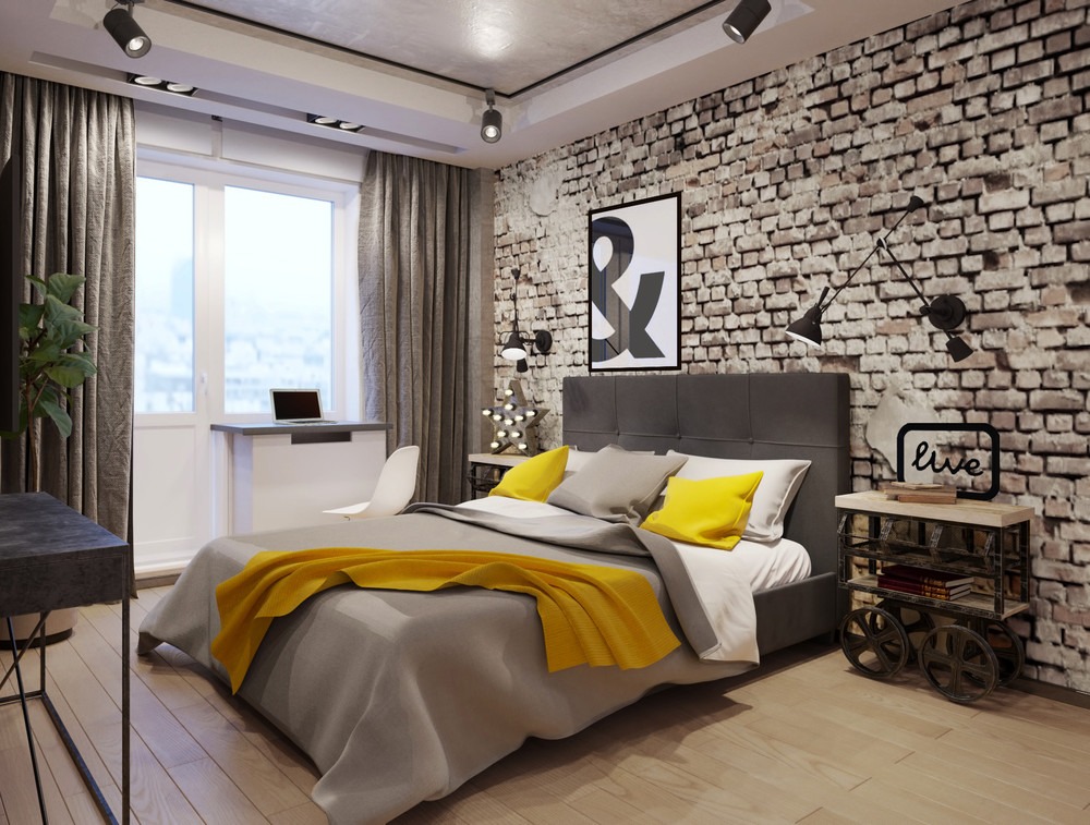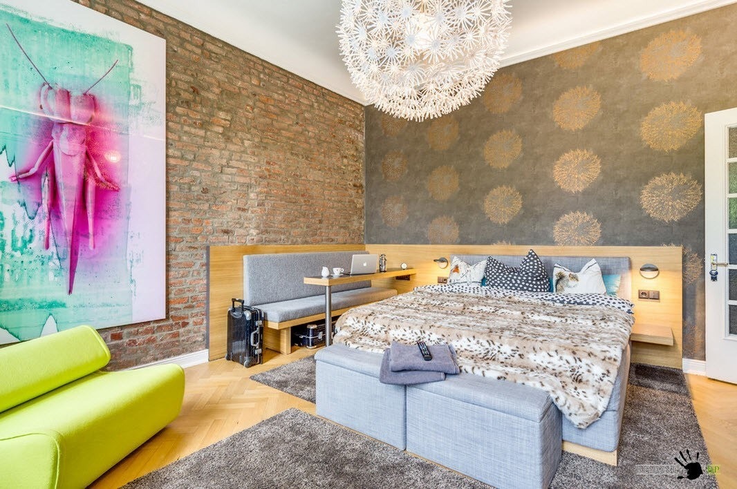 The number of bricks in the decoration of the walls can be different, depending on the type of concrete layout. For example, in one case it is a pair of columns, in the other - one wall, in the third - only a part of the accent wall in the area of the head of the bed. A brick can be not only natural: thanks to the possibilities of modern production, the wall can be imitated. At the same time, high-quality lining reproduces the required type of material quite accurately.