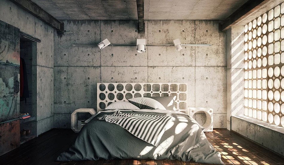 The vertical surfaces of a loft-style bedroom can be covered with coarse plaster or paint, as well as metal panels. As for concrete, it should be more in the design of the room than in other finishing materials. At the same time, it can be used both for wall and ceiling decoration, and for floor covering. Concrete contrasts well with the metal, which is also used in the decoration of industrial facilities.
