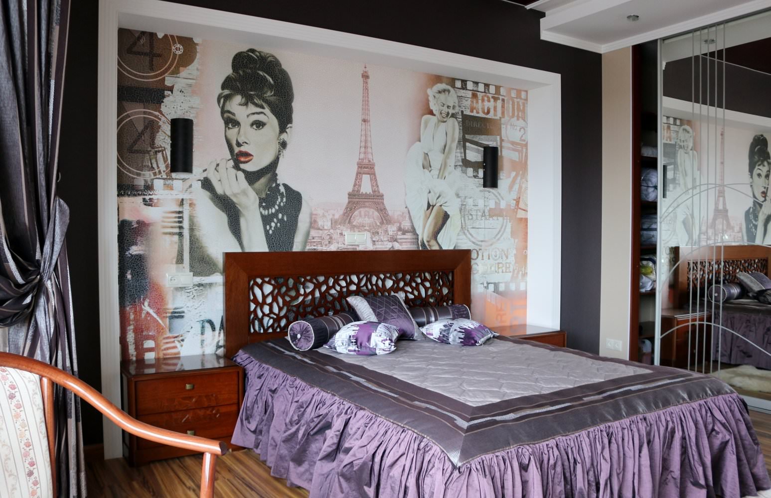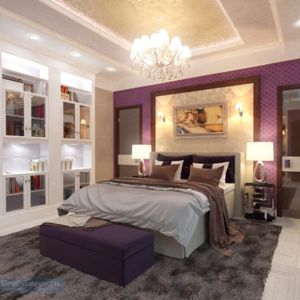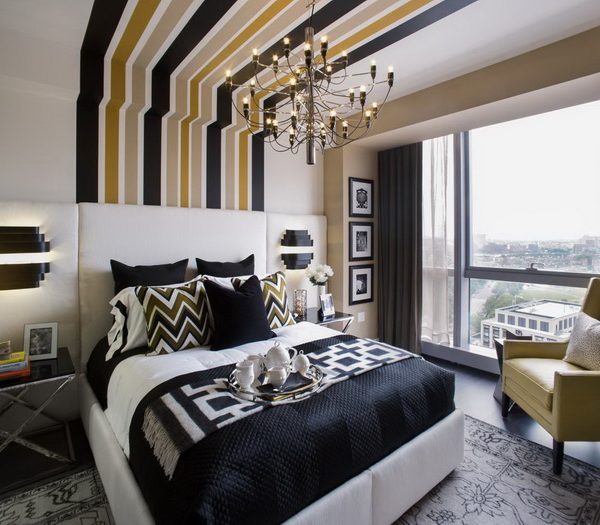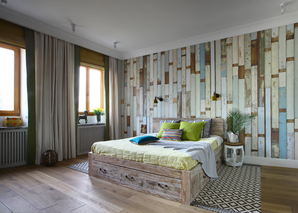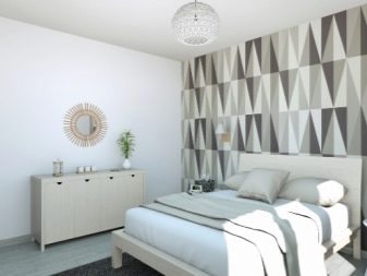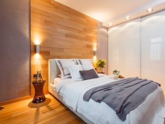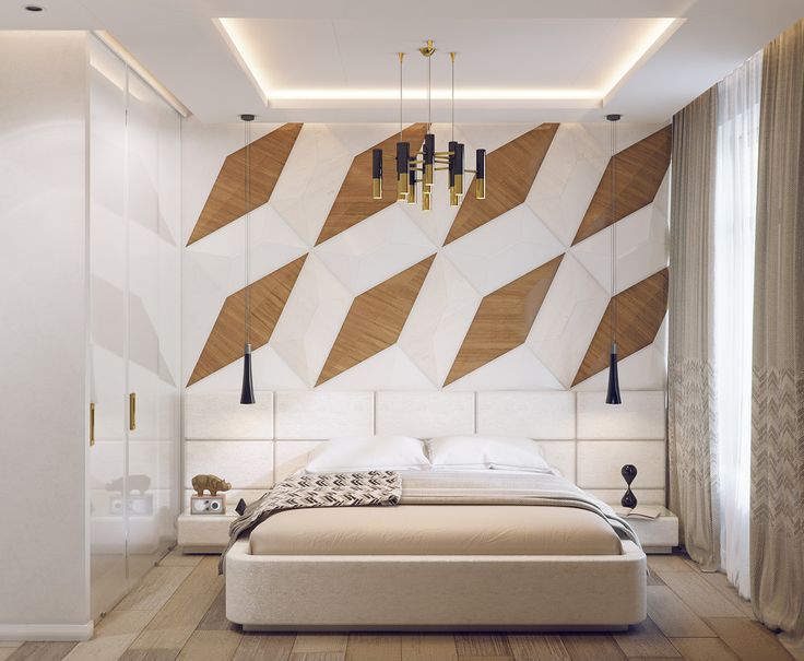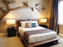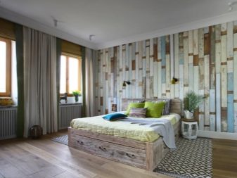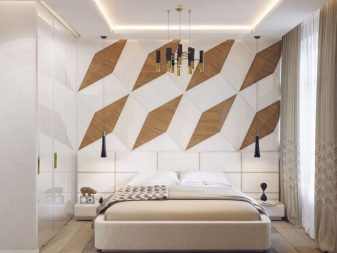 This design is interesting because it can be changed quite often. If one option becomes boring, in a couple of years, by transforming only one wall, a visual change in the whole image of the bedroom is achieved.