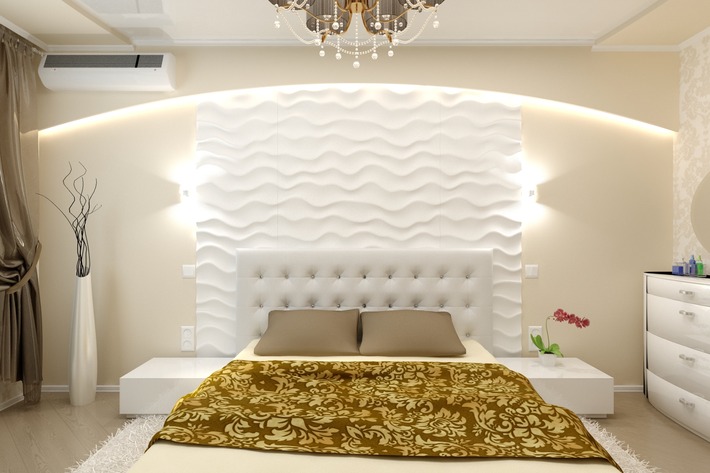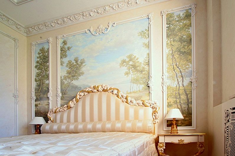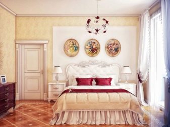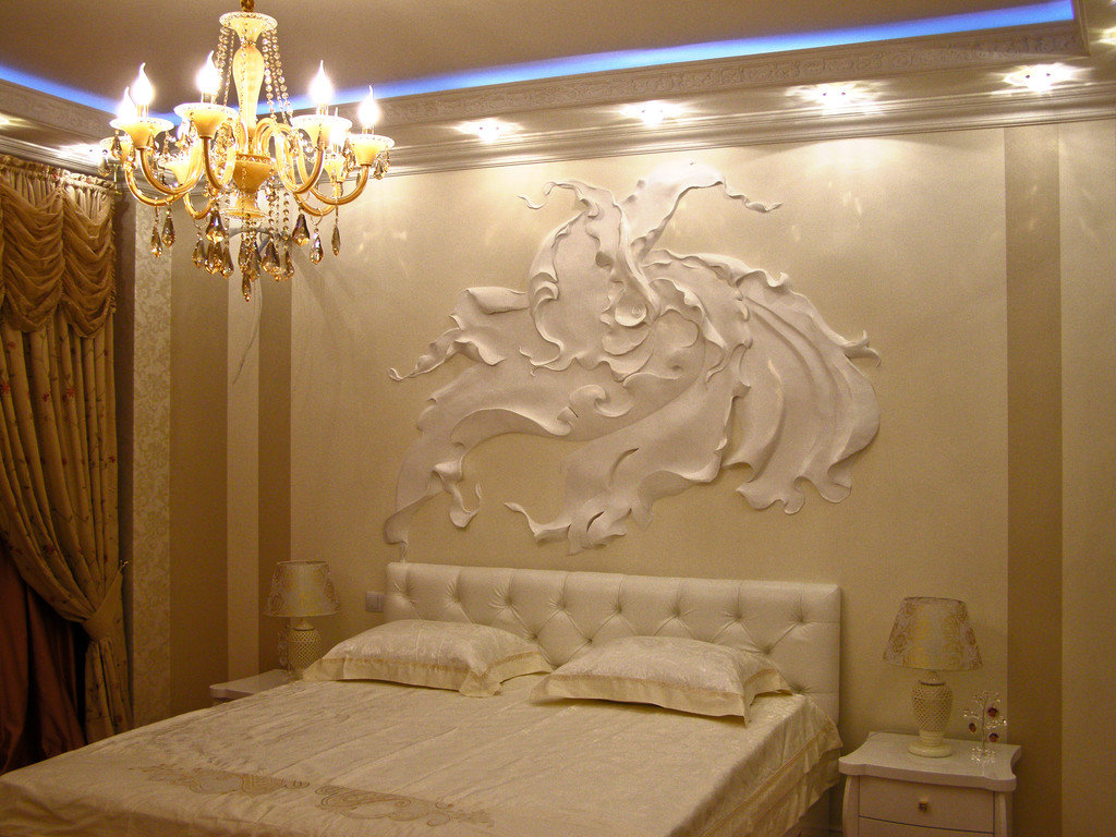But if you are a supporter of classic solutions, then the plaster decoration of the head of the bed will make it a truly royal bed. The splendor of abstract ornate decorative elements may be in color to match the furniture, but may be the same in color with other interior accessories. However, most likely, this solution requires additions - for example, you need to make special linings on the legs of the bed and bedside tables. If the stucco is present only at the head of the bed and nowhere else, this decor cannot be traced, it can look like an alien element in the interior.
