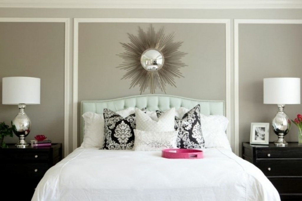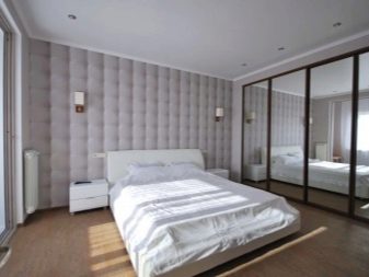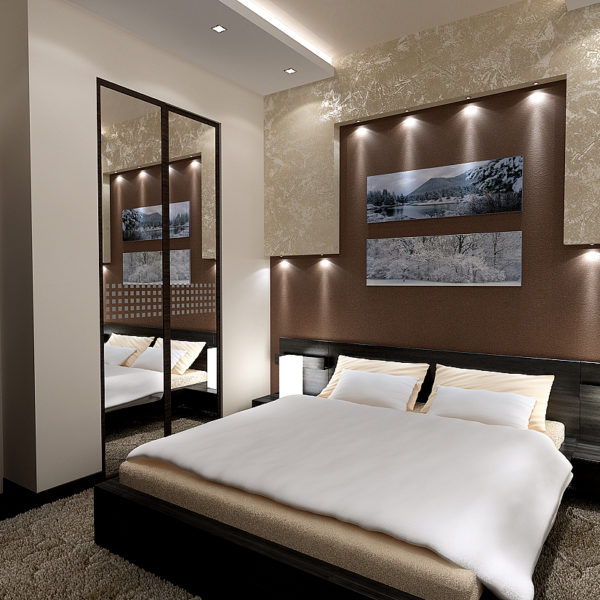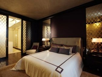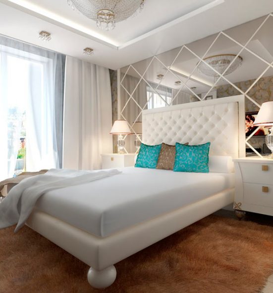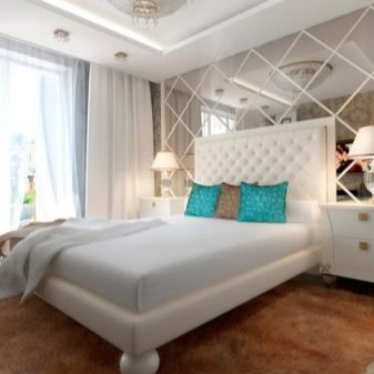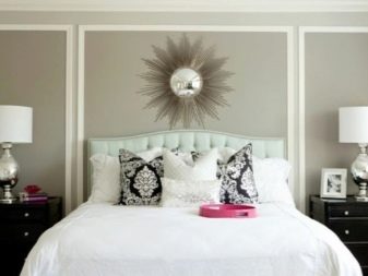 - Mirror décor has become fashionable in the last decade, but be wary of such solutions. Mirror or mirror composition should be placed at least 40 cm from the mattress, not lower. Psychologically, such surfaces can overwhelming act, because the option is not for everyone. And in terms of practicality, a mirror is not the best option.