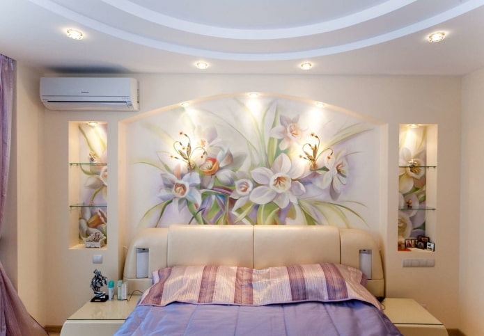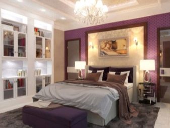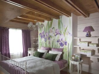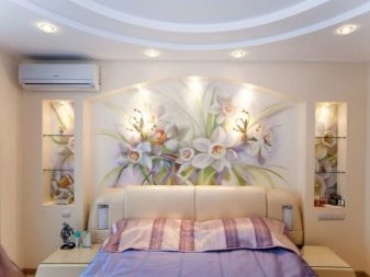 - Volume design. The reverse case - something is taken that visually changes the decision of the wall, for example, the shelves above the bed with flowers or books may well allow this area to look quite different.