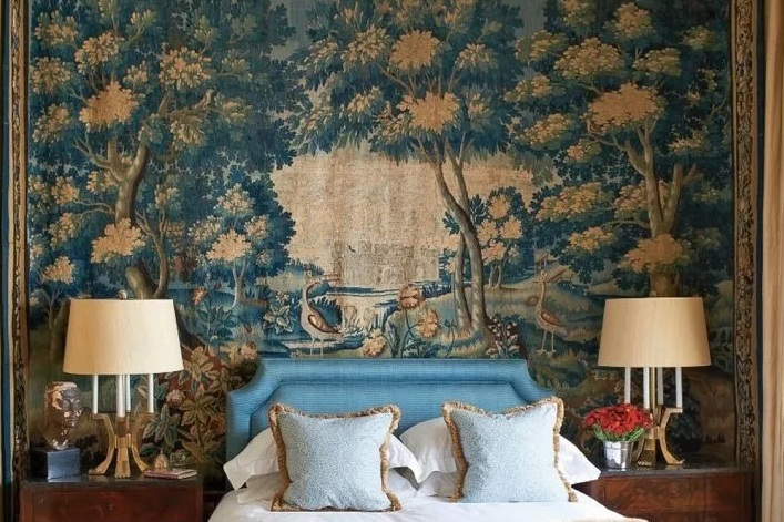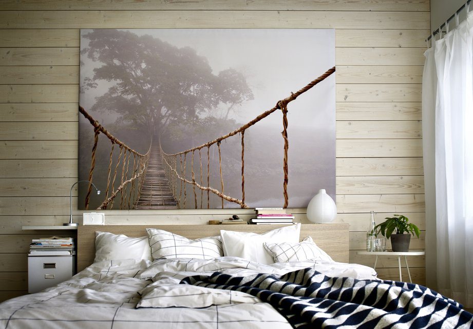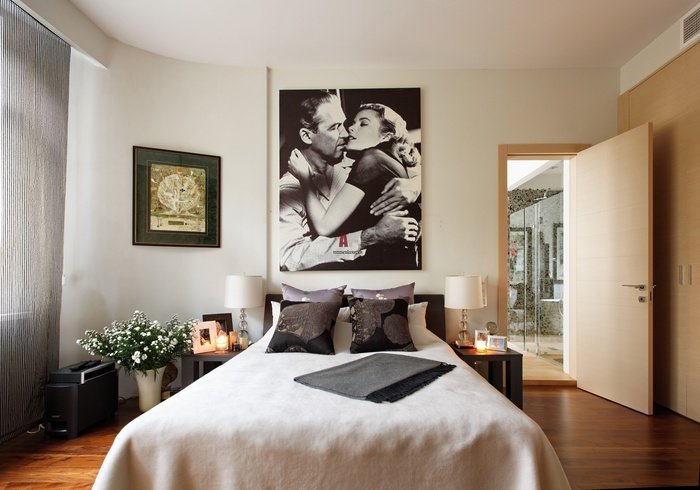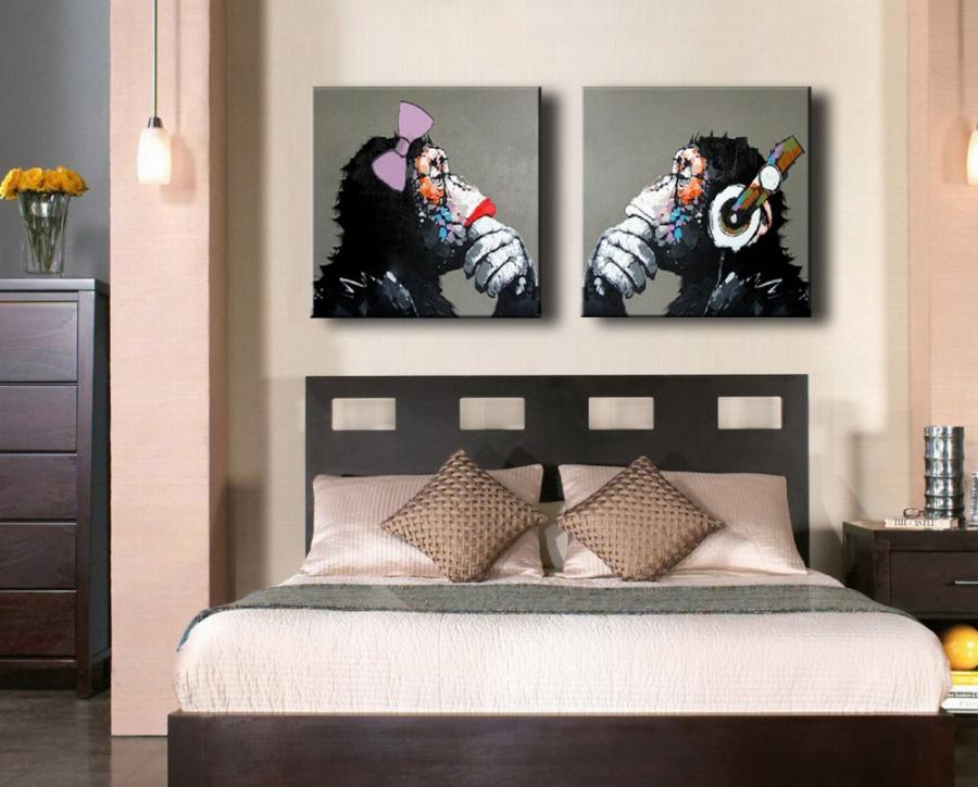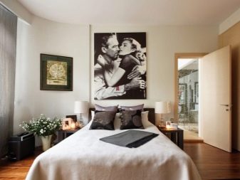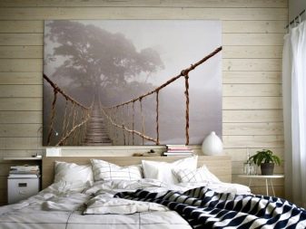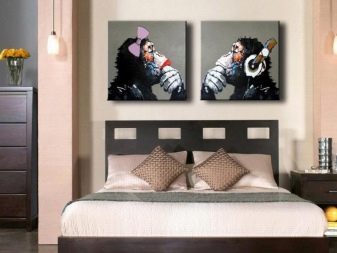 - If you decide that those who hang a picture in this area are doing the right thing, then hang it at eye level. Remember that the type of drawing and style should not fall out of the interior theme. In the bedroom of the Baroque, a picture in the style of Kandinsky would be inappropriate, and in minimalism Shishkin's motifs are alien.