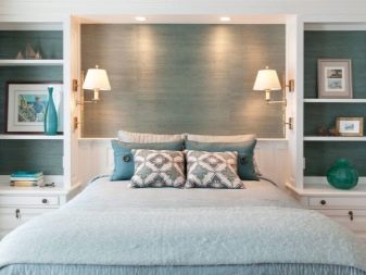 - Shelves and niches above the bed - the solution is certainly practical. But far from everyone is comfortable: not everyone likes to sleep with the feeling that something is standing above his head (and, accordingly, at any moment can fall). And, of course, hitting the shelf with your head is a risk, because if you hang a shelf above the bed, the height should be a comfortable, not constraining movement.
