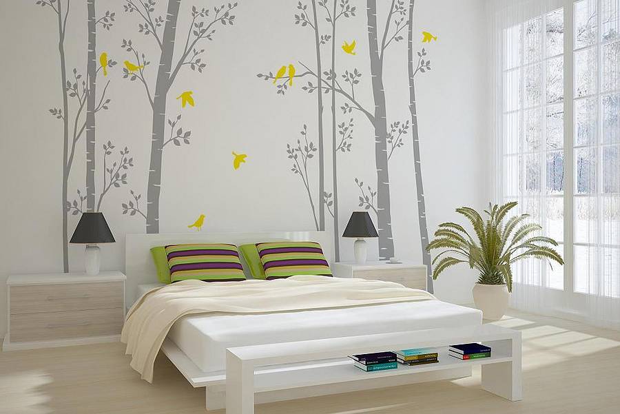- Landscapes. For example, you buy stickers imitating the design of a tree, swings under them and thick summer grass, flowers, flying butterflies. No postmodernism, just sweet romantic composition. Sometimes in the bedroom just such a mood is needed - a soothing picture with eternal ideas of quiet happiness, memories of childhood.
