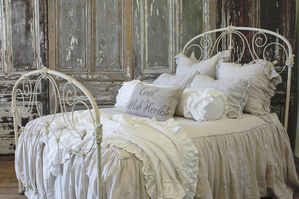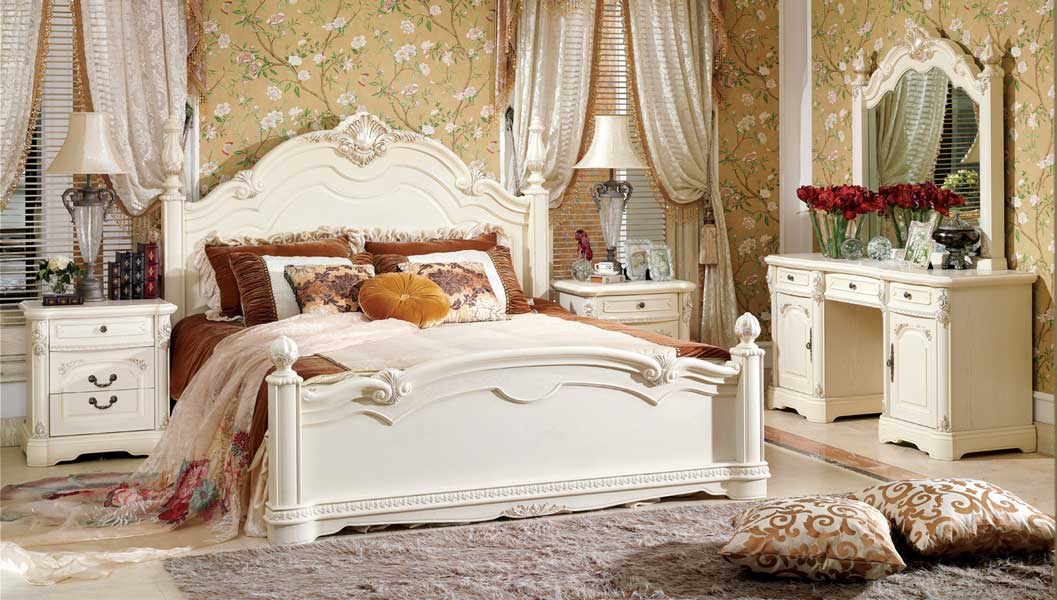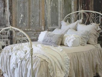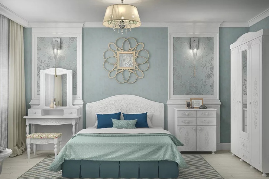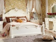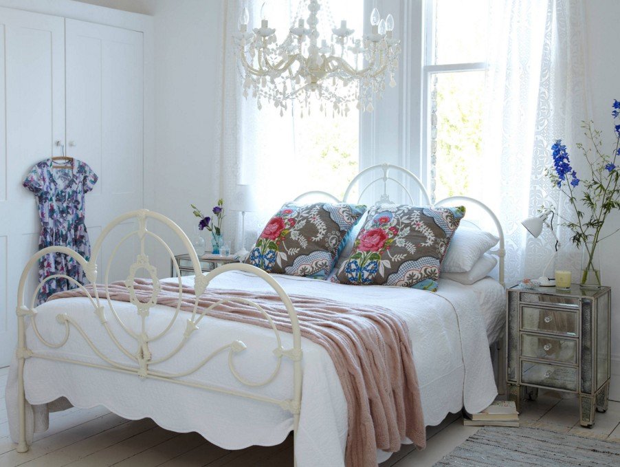 An excellent option would be a bedroom in pastel colors and a set of furniture in vintage style. The white bed adds a modern accent, diluting the old-fashioned furniture of the past. You can buy an iron bed with wrought openwork back - then the whole interior is completely immersed in vintage.