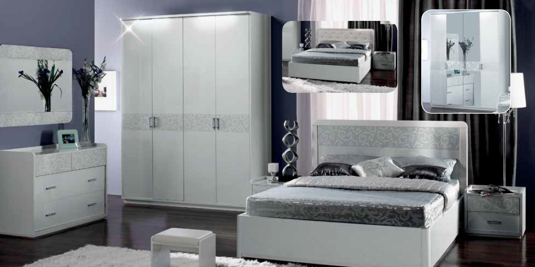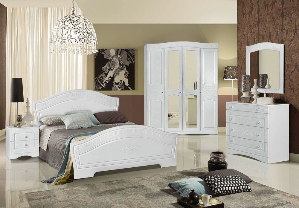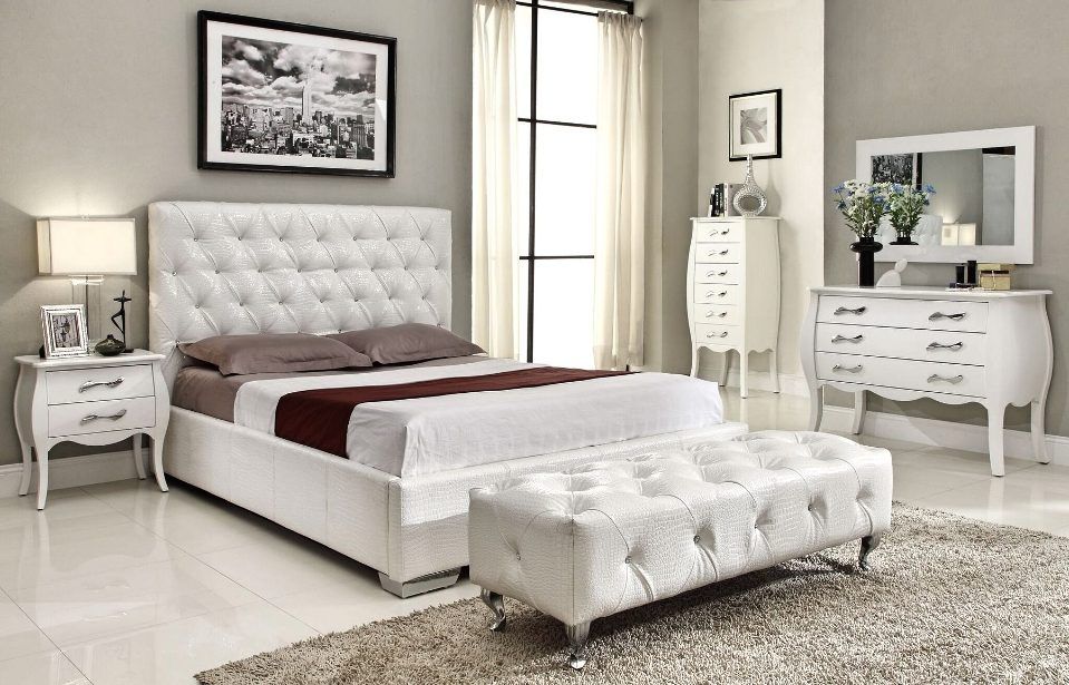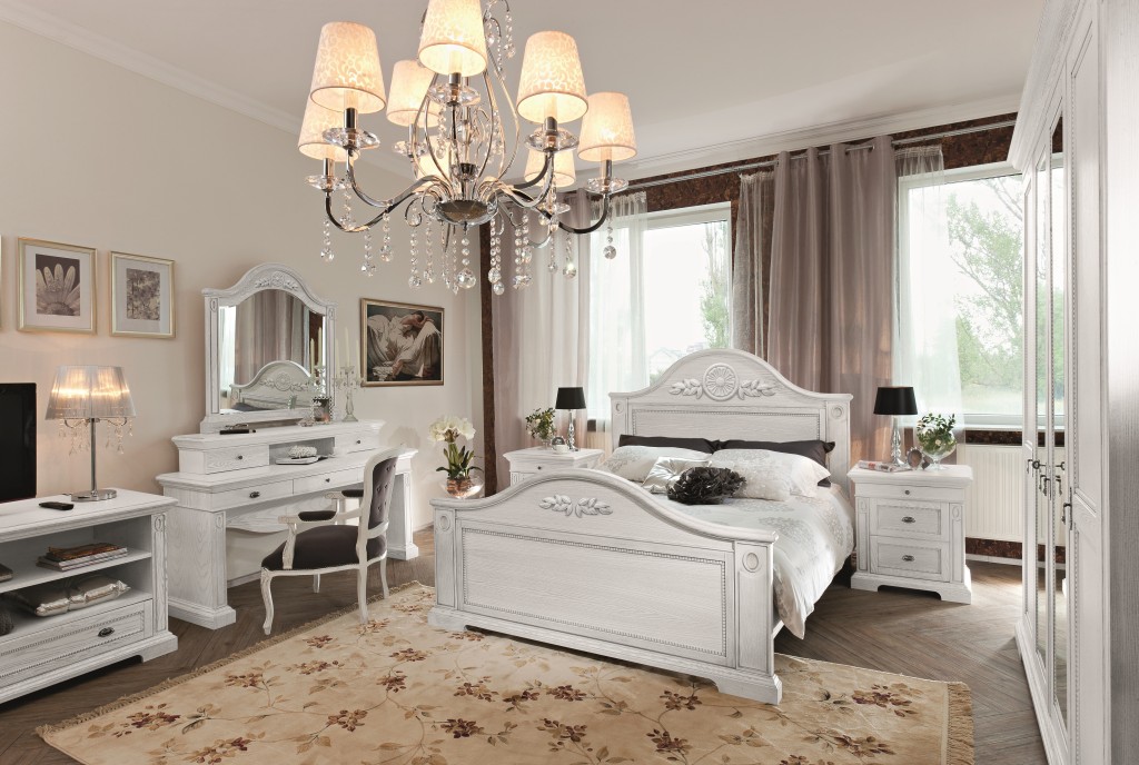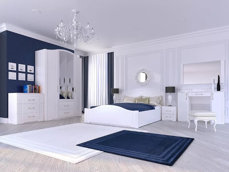 White bedroom set with a complete set of furniture: a wardrobe, a bed, side tables and a dressing table.