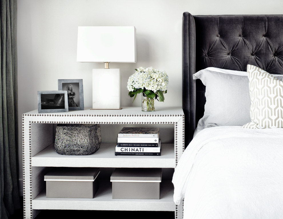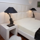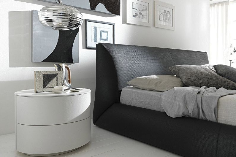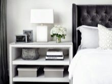- A good option bedside tables in the style of minimalism. Pay attention to the completely smooth features, rectangular shape and white, neutral color, creating a pleasant contrast with the black bedspread on the bed.