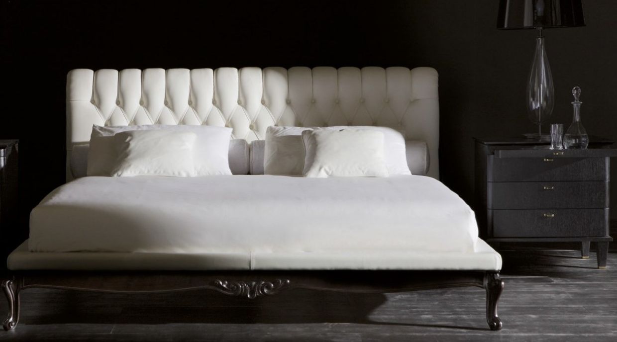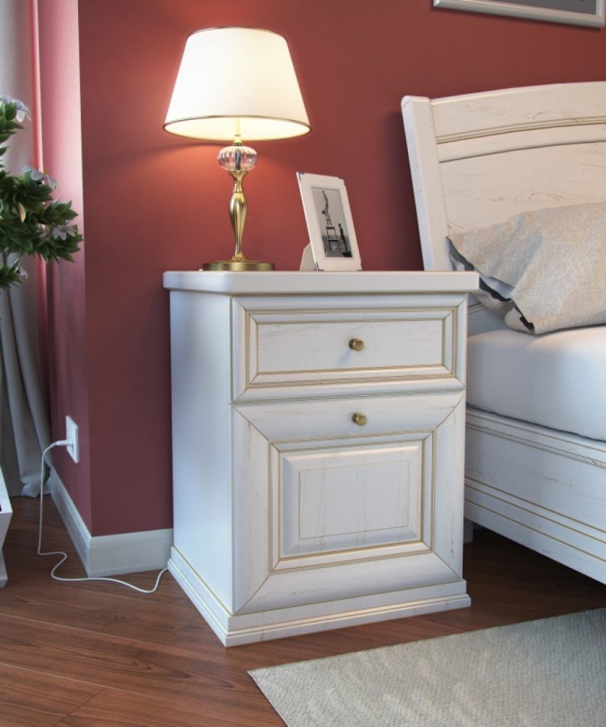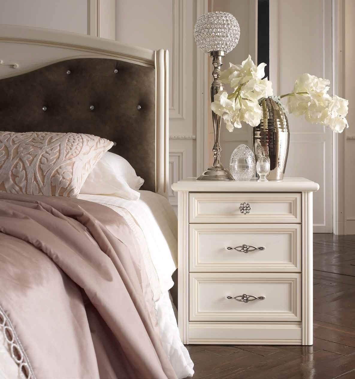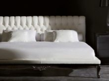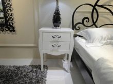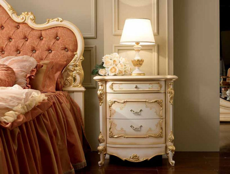 - Option design bedside tables in the style of a classic. The model is made in a light cream color, like the head of the bed. And also there are rounded legs, but the model remains concise and strict.