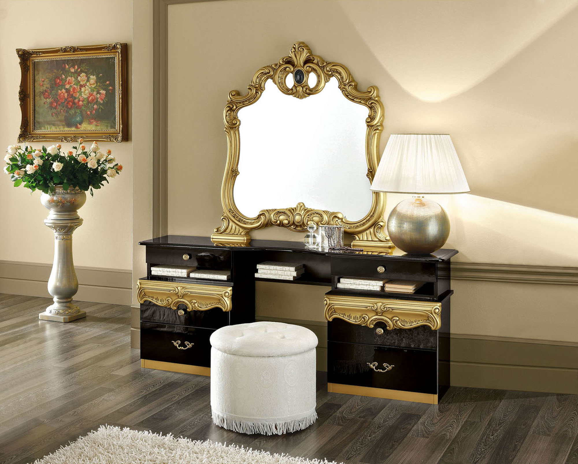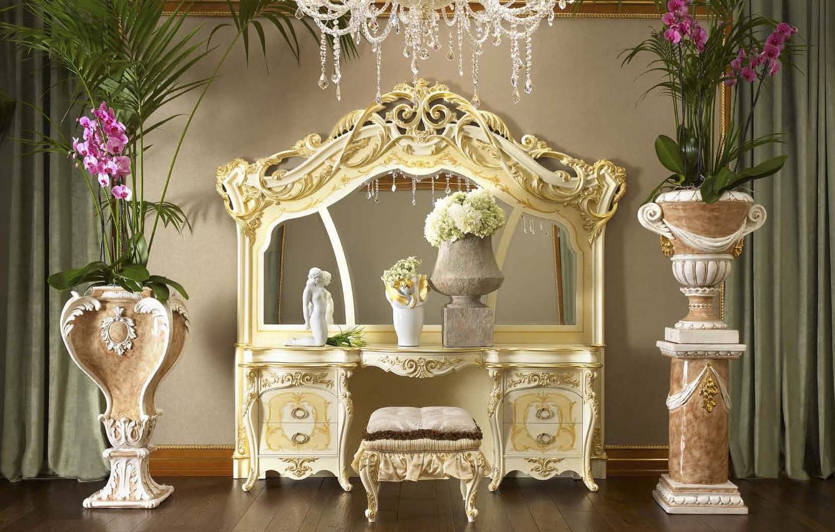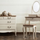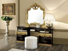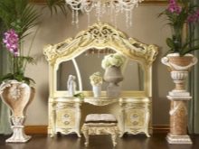 Making a bedroom in the Baroque style, you will have to find a rather large structure made of solid wood and decorated with carvings. The mirror should be picked up with a heavy solid frame. For the style of futurism, a hanging console of a catchy shade and a bright backlight will do. For a room decorated in the Scandinavian style or loft, simple tables made of natural timber with a minimum number of decorative elements are suitable.