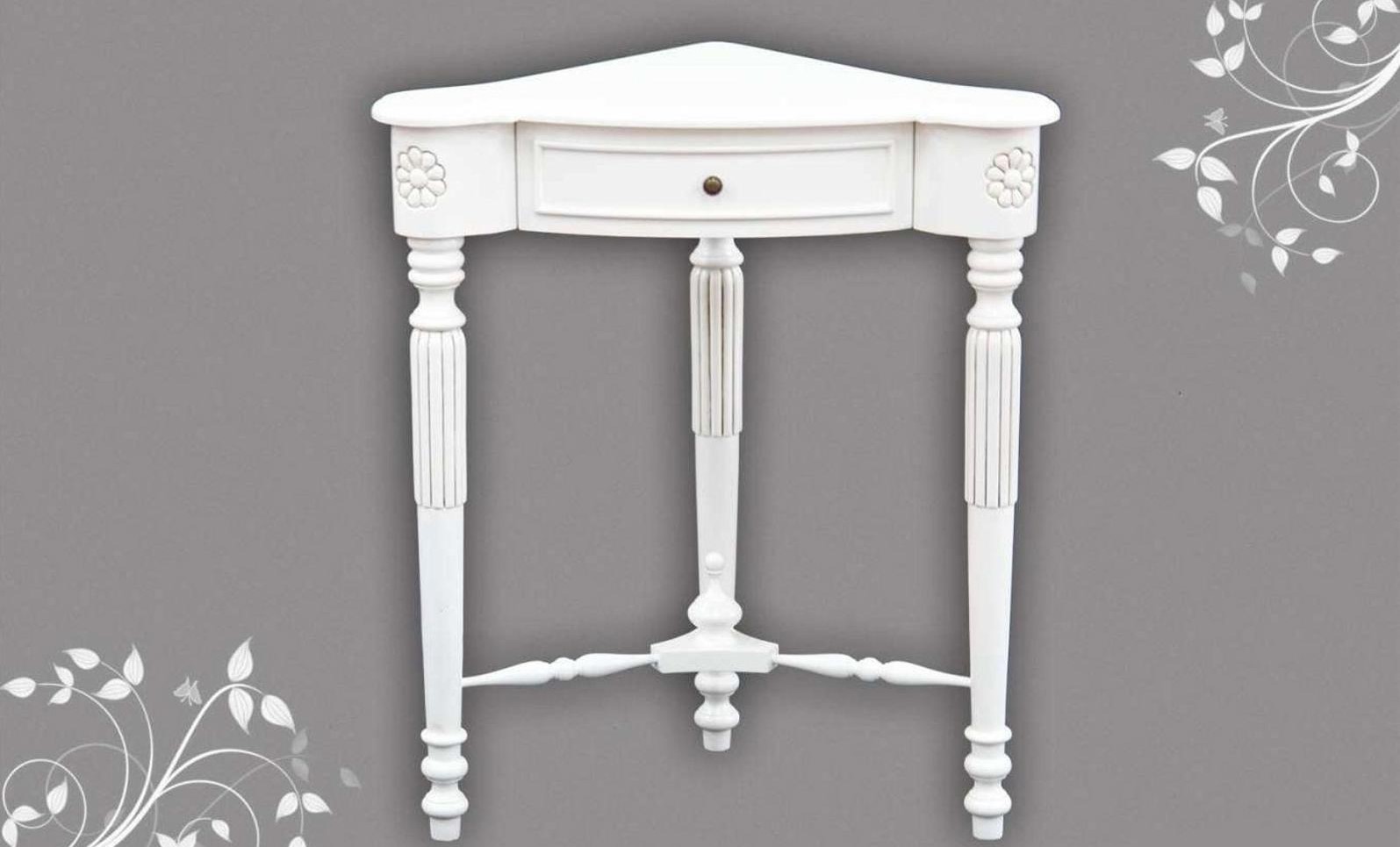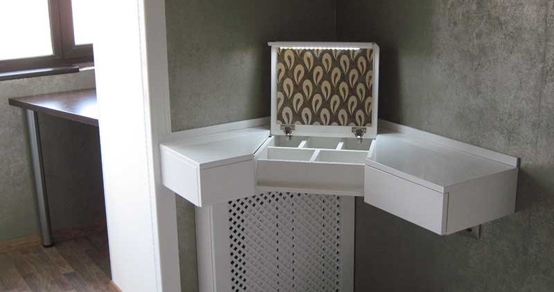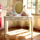 Corner dressing table allows you to fill unused space, besides helping out in a situation of small room footage. The corner model is made suspended, floor or console. The hanging table has no legs, and it is fixed on the wall. Floor table has four pillars and is, in general, the usual design. Console dressing table is considered something intermediate between the previous two. It simultaneously has supports and fixtures on the wall.
