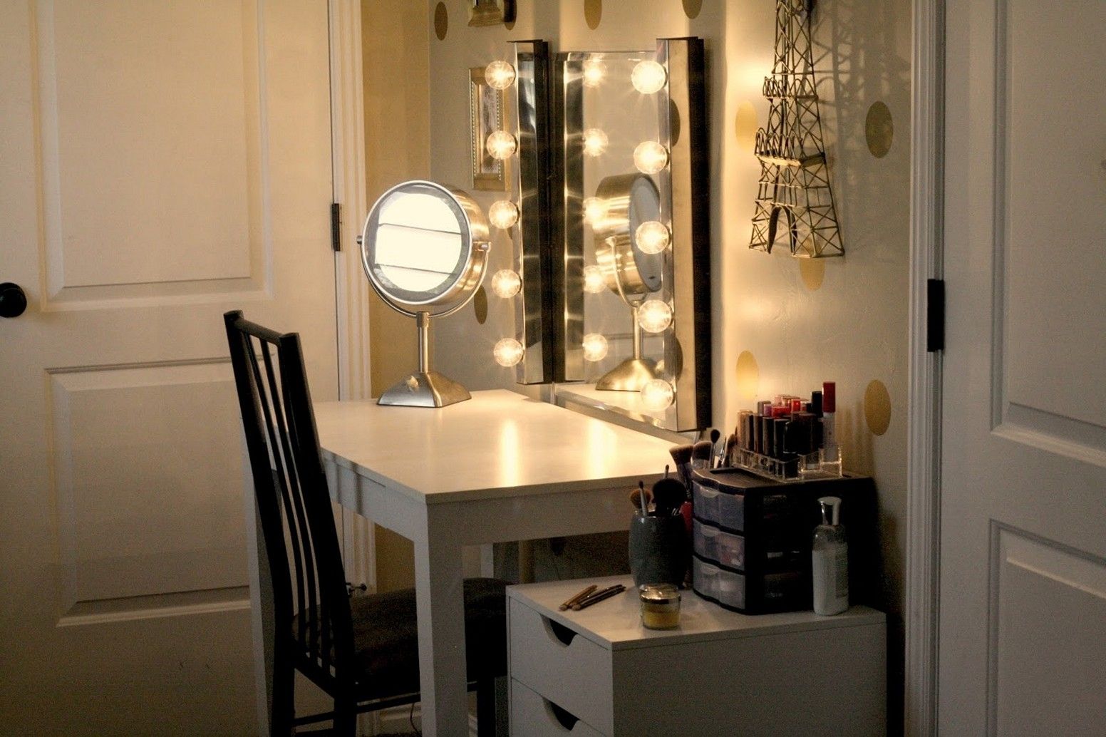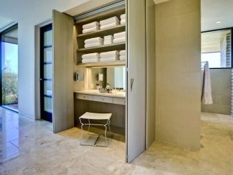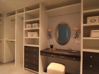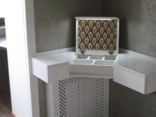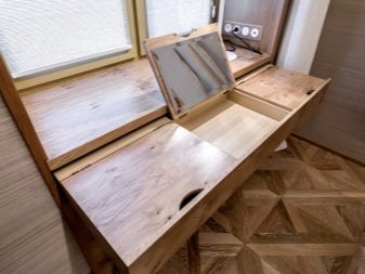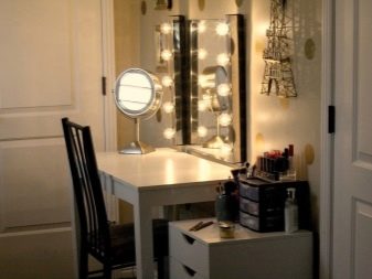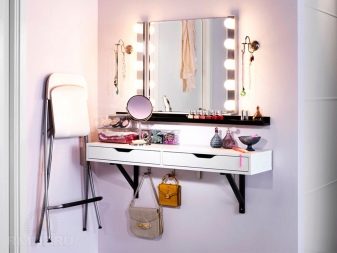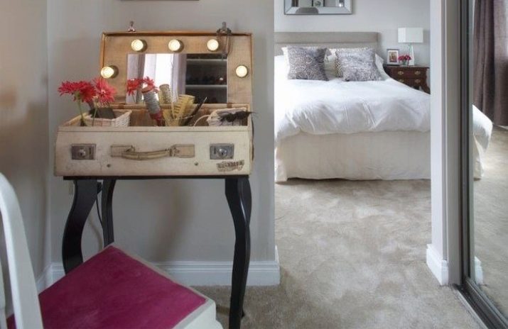 Additional shelf under the mirror solves the issue of storing varnish. Folding chair is located on the hook, fixed on the next wall. If there is no place for a beauty zone at all, then the dressing table will turn out to be built even from a small suitcase. On the inside of the lid is a mirror with light, and the container itself is used to store the necessary cosmetics.