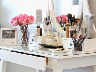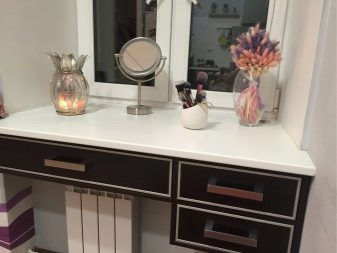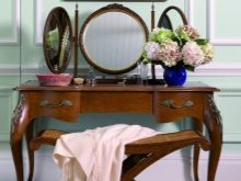 The height of the seat should be chosen so that the person who is going to use it on a regular basis, was comfortable. Comfort - the main condition and with regards to the selection of the mirror. Each woman should decide for herself whether it will be convenient for her to observe herself to the waist, whether a small table mirror will be enough or even several copies will be required due to the width of the table. In the case when a very large mirror is taken, it is recommended to supplement it with a narrow console.