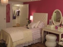 A round mirror does not connect with the structure, but is individually suspended from the wall. Wooden table fixers echo the wooden legs of the stool, covered with a pink seat mat. A table lamp is used as a light source. A similar model of the toilet table can be added with hooks under the console, which will create additional possibilities for storing bags. A more glamorous bedroom style will allow you to choose a square mirror with bright backlighting.