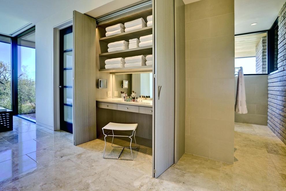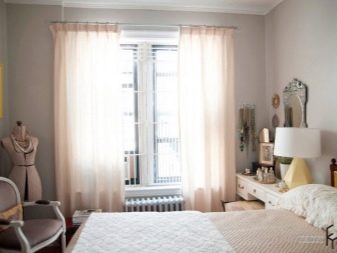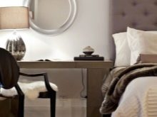 If the room is small, and you still want a table, you can go for a trick. A small console is fixed on the cabinet door, and the folding chair is easily hidden behind the door during non-use. In addition, as mentioned above, it is worth thinking about hiding the furniture inside the cabinet. In the absence of space, one of the bedside tables should be abandoned, and the necessary space should be put in the empty seat and added with a hanging mirror. Finally, a great solution would be the transformation of the window sill.