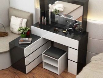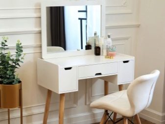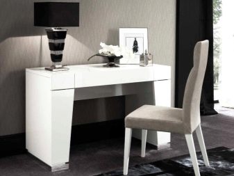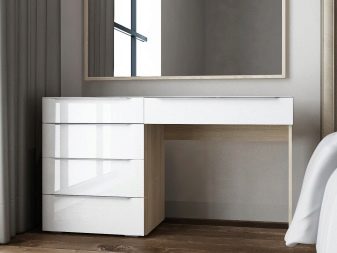 Modern styles allow you to choose a dressing table that fits perfectly into any existing bedroom interior. Minimalism implies a solid and folding design, often white, with flat drawers without handles and, possibly, folding details. It will look good and wood, and glass, and even plastic. Provence style requires wooden furniture, an unusual mirror frame and decorative fabric elements echoing the pouf. For high-tech style, elongated and narrow consoles with metal legs are selected. The interior in retro style will perfectly complement the wooden construction, refined "antique".